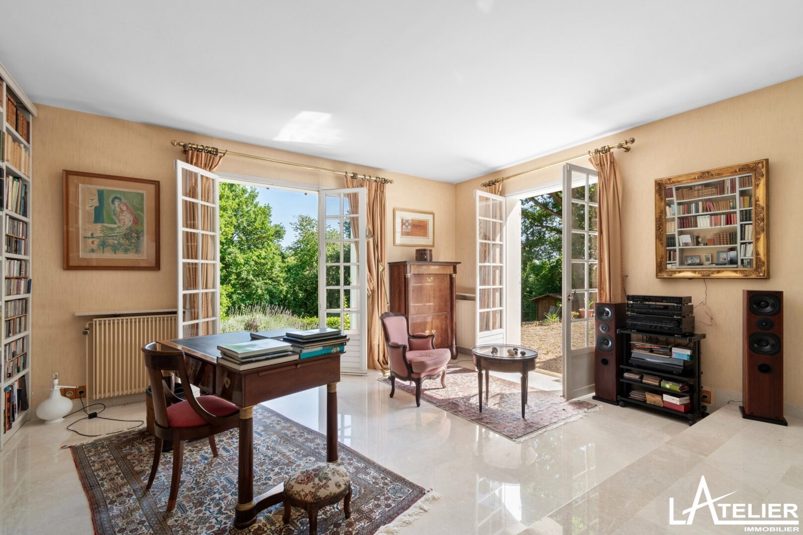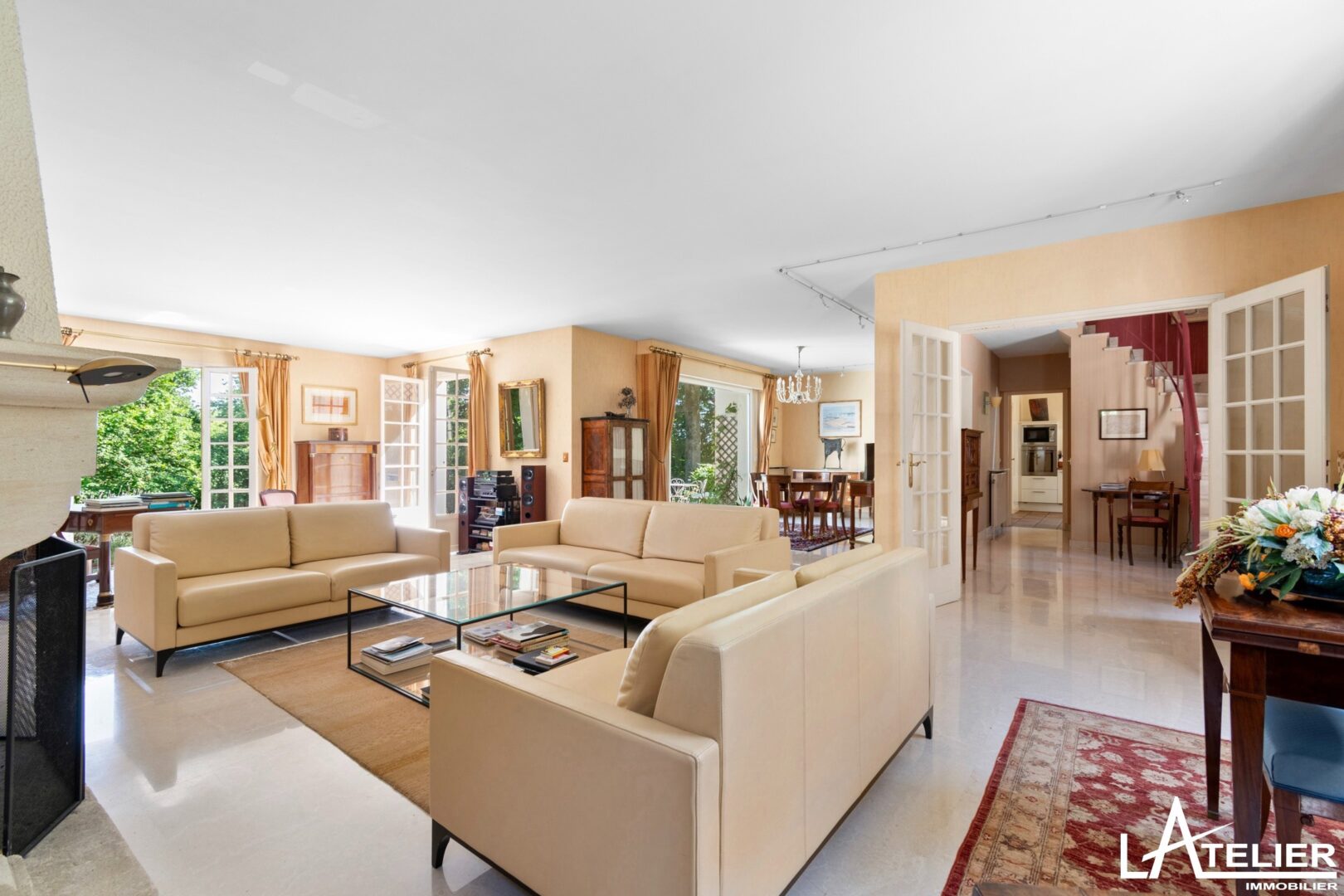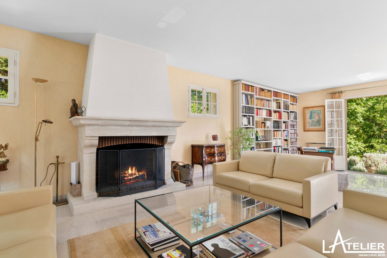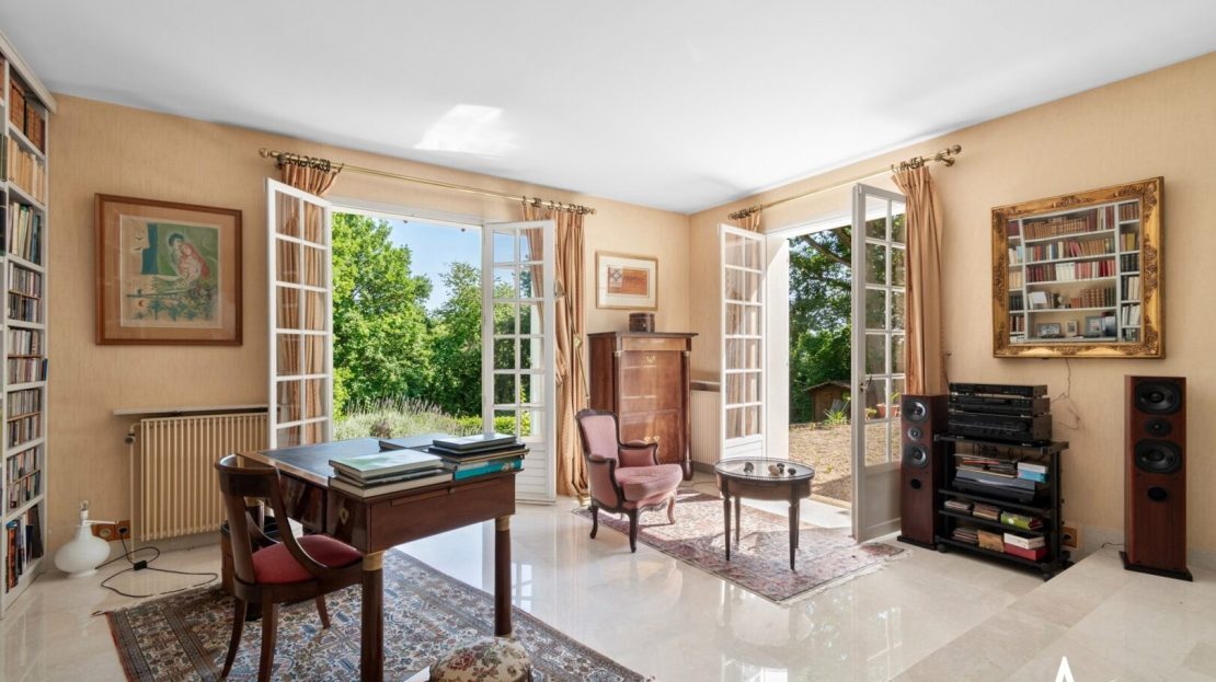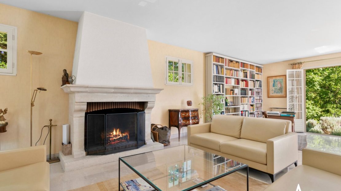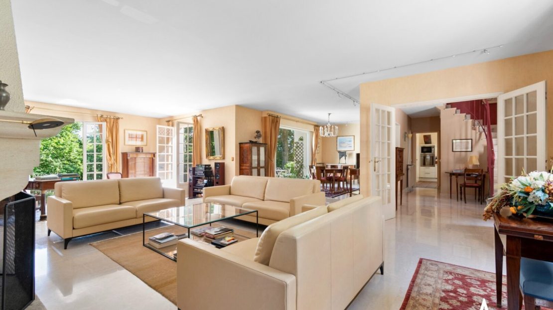 Le hall d’entrée déjà élégant, avec vue sur la coursive du 1er étage et les espaces de réception donnent le ton de la propriété. Une grande partie du rez-de-chaussée est consacrée aux espaces de vie et de convivialité avec plus de 100 m2 répartis entre salons avec cheminée, salles à manger et cuisine (entrée de service). Le tout donne de plain-pied sur terrasse et jardin et bénéficie d’une lumière naturelle en toute saison, grâce aux larges ouvertures (triple expositions) sur le jardin à l’allure de petit parc.