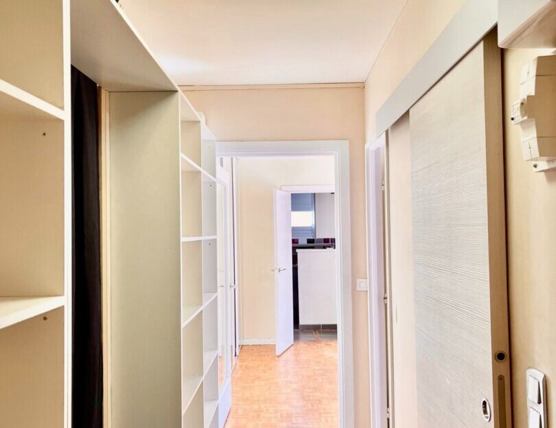 Il se compose d’une entrée avec de grands rangements, wc séparés + salle de bains, 2 chambres, une cuisine semie-ouverte, un séjour donnant sur grand balcon, et mur de placards, très fonctionnel.