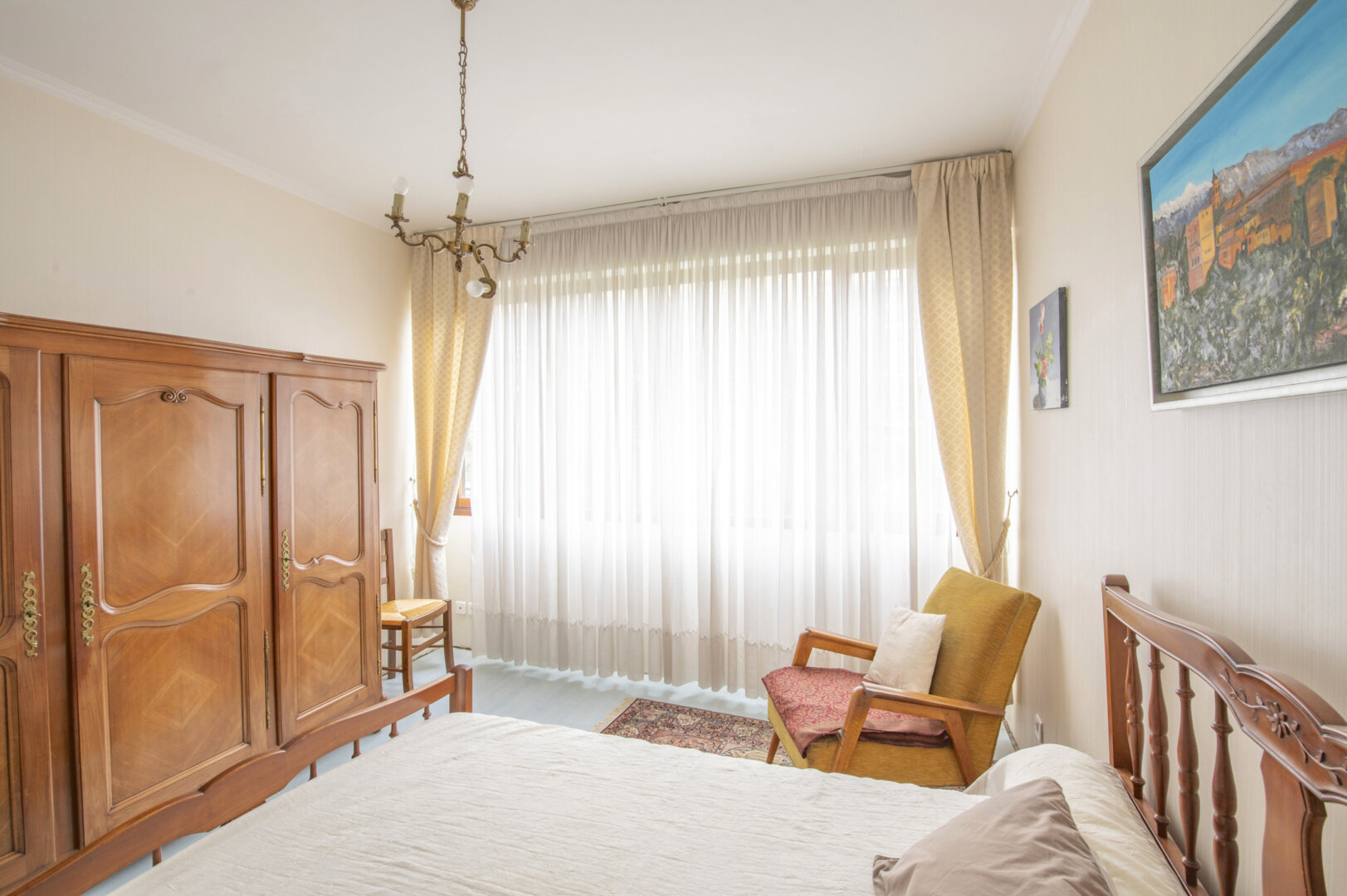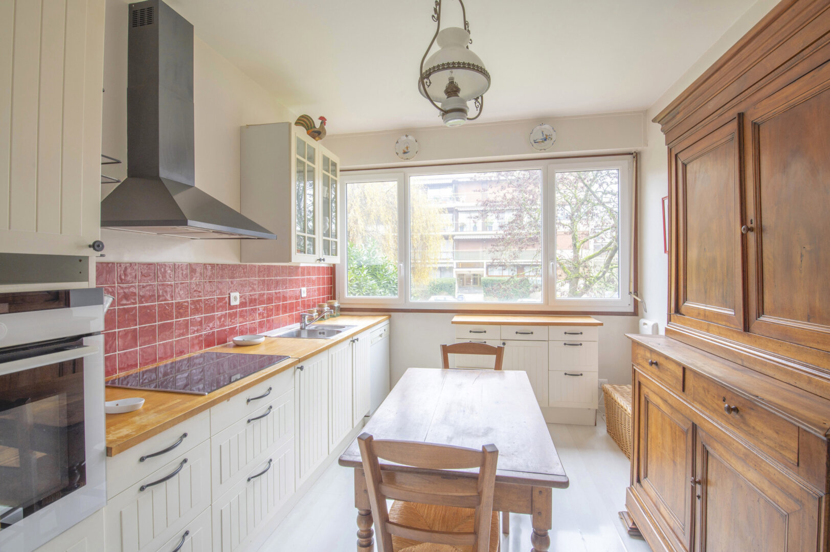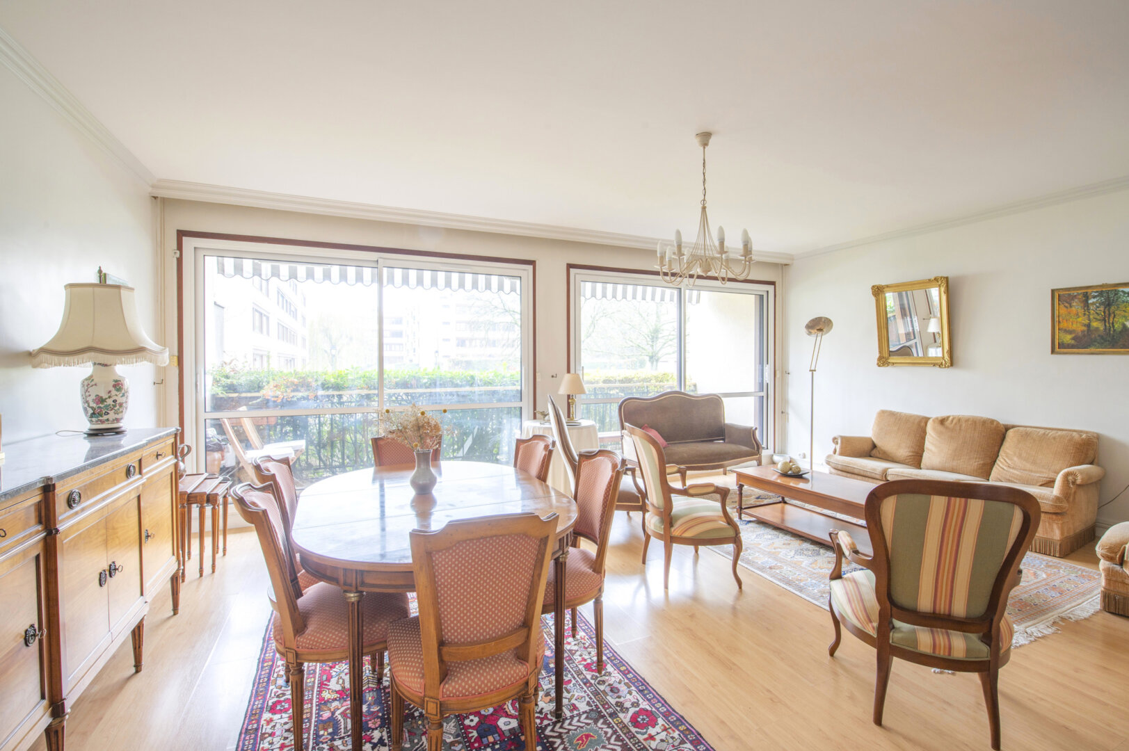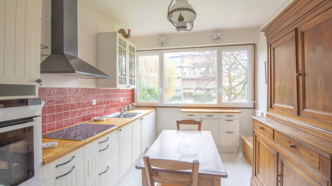 Cet appartement en rez-de-chaussée surélevé avec vue dégagée sans vis-à-vis, lumineux, soigné, avec de belles hauteurs sous plafond vous offre une distribution optimale. Il comprend : une entrée, un double séjour exposition sud-ouest, parquet chêne en excellent état, de grandes porte-fenêtres double vitrage alu de belle facture avec volets roulants électriques, accédant au balcon à l’abri des regards vous permettent d’y prendre vos repas ou de vous détendre en toute quiétude, une cuisine aménagée équipée.