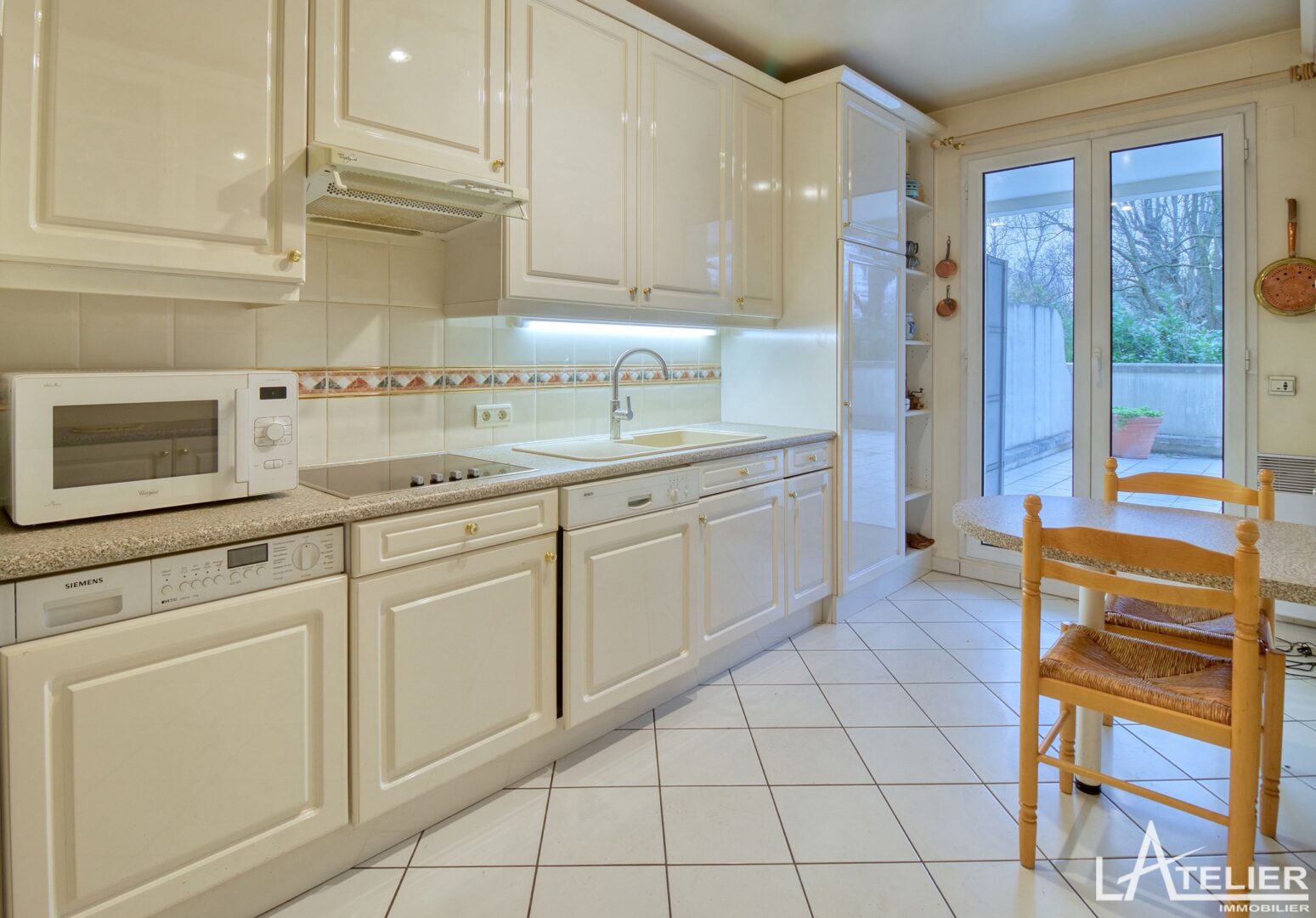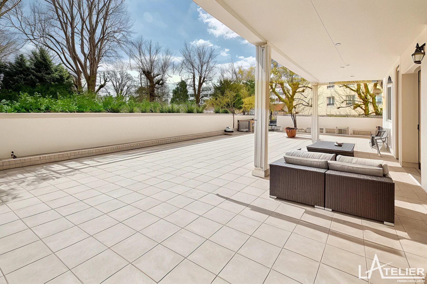 – De beaux espaces de vie : Grand séjour avec salle à manger, cuisine séparée (mais pouvant être ouverte), le tout ouvrant sur une immense terrasse de 117 m² bordée de verdure, sans vis-à-vis et au calme.