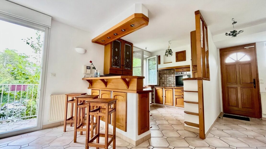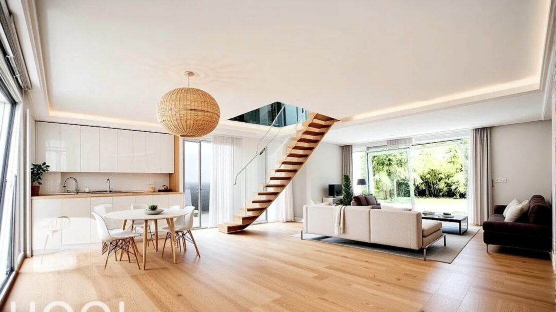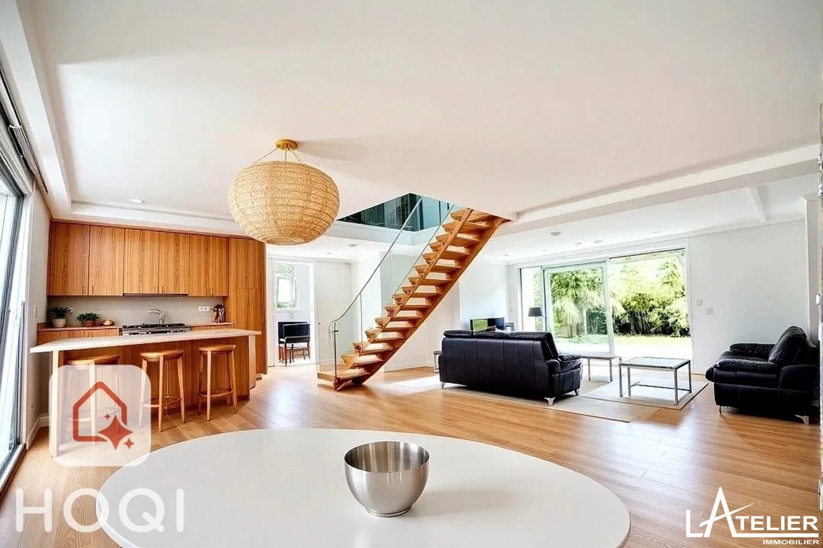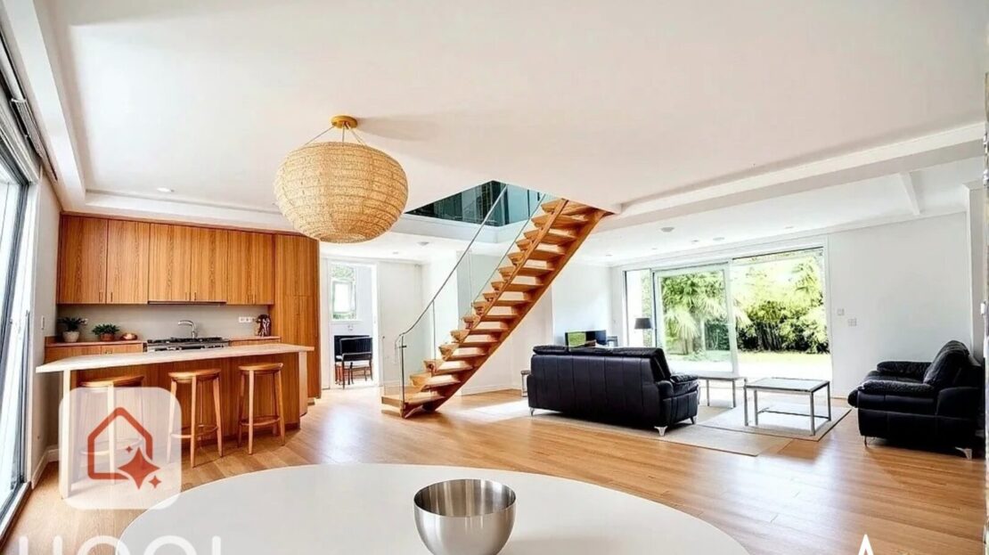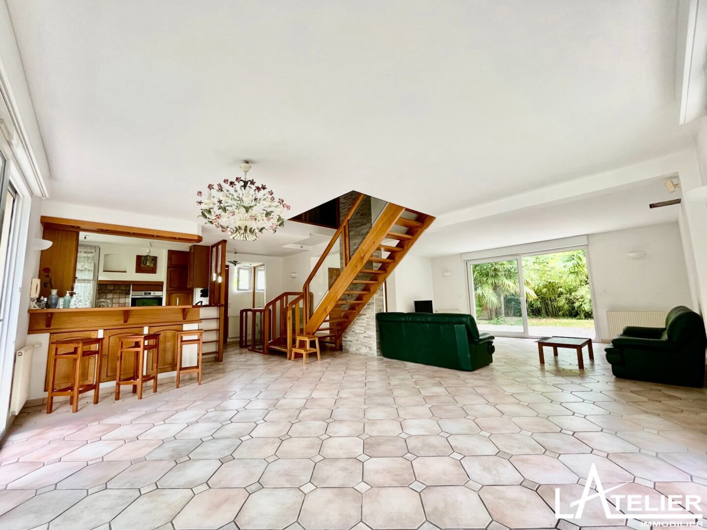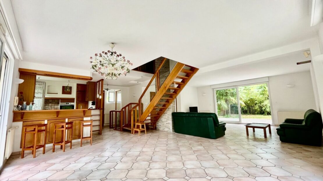 -Au premier étage, vous arrivez dans une magnifique pièce de vie lumineuse et traversante (triple exposition) avec un escalier en toit cathédrale, donnant sur une grande terrasse avec coin BBQ. L’espace séjour est constitué d’une cuisine ouverte sur la salle à manger et d’un salon avec possibilité de cheminée ou poêle. Nombreuses ouvertures permettant l’accès à la terrasse, au jardin, salle d’eau + toilettes invités, et chambre attenante au séjour.