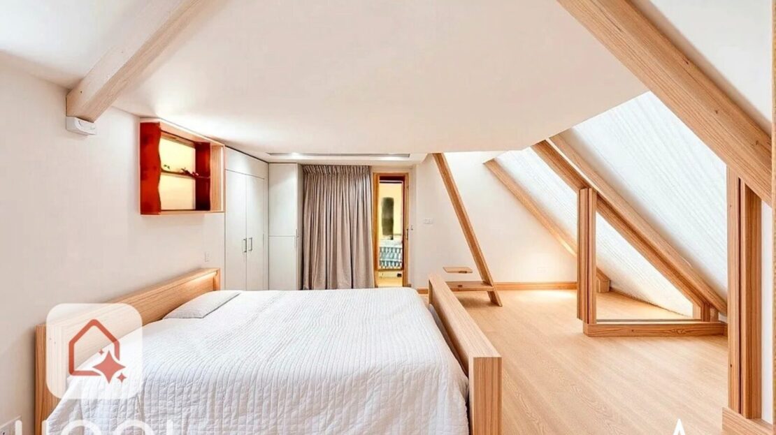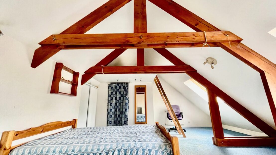 -Le dernier étage est sous les toits, et se compose d’une première pièce qui peut faire office de bureau, puis une grande chambre avec sa salle de douche.