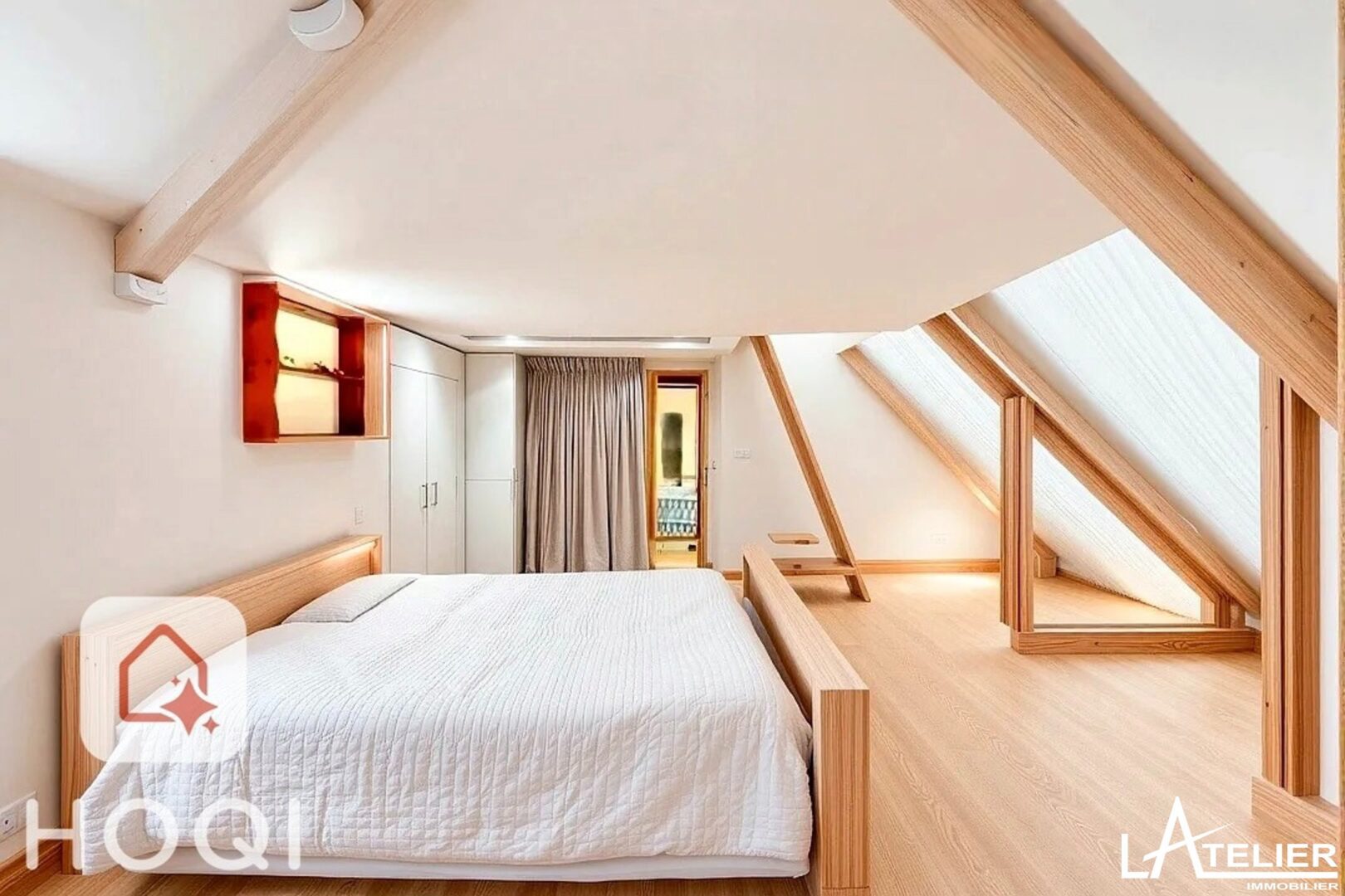 -Au second étage, vous montez par un escalier en chêne massif clair et verre, avec une très belle charpente apparente, et vous trouverez 3 chambres, une salle de bains + douche, un grand espace pour des bureaux ou rangements.