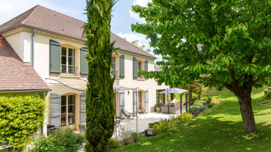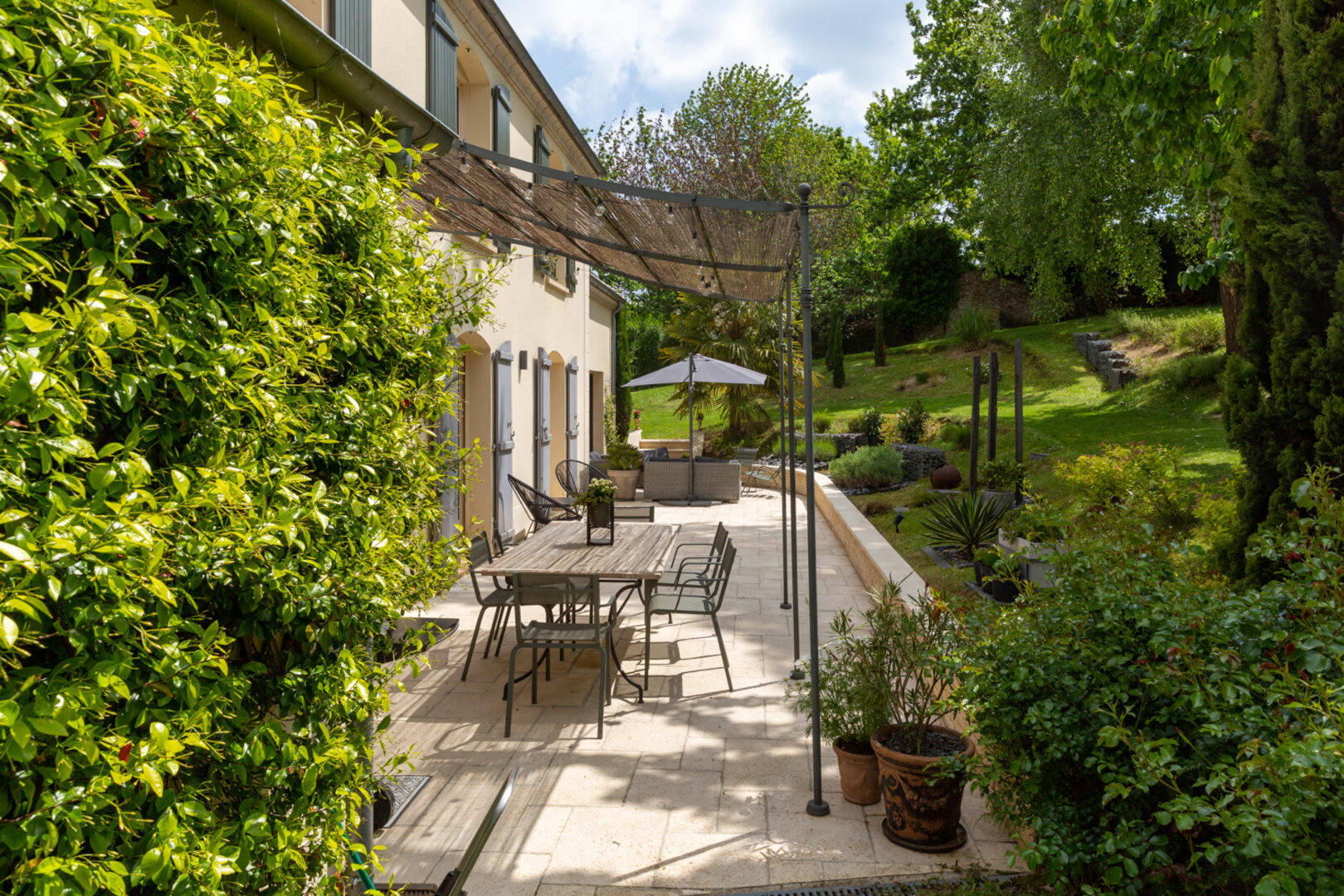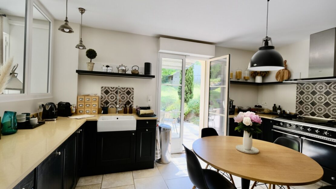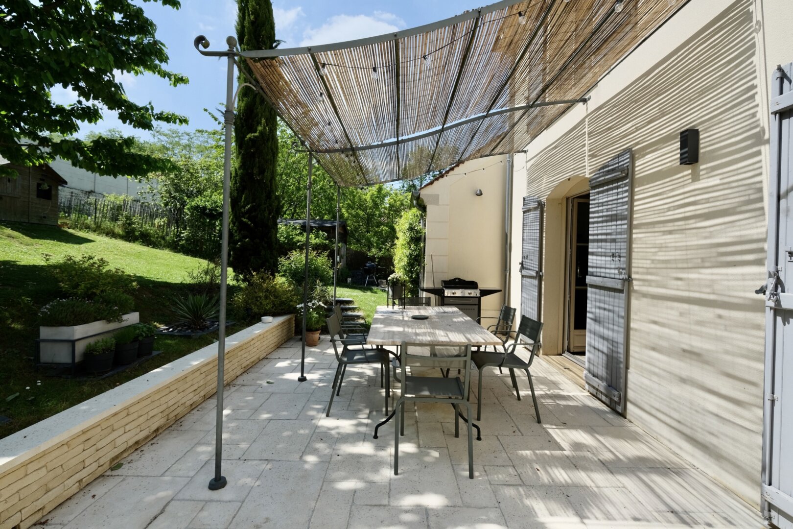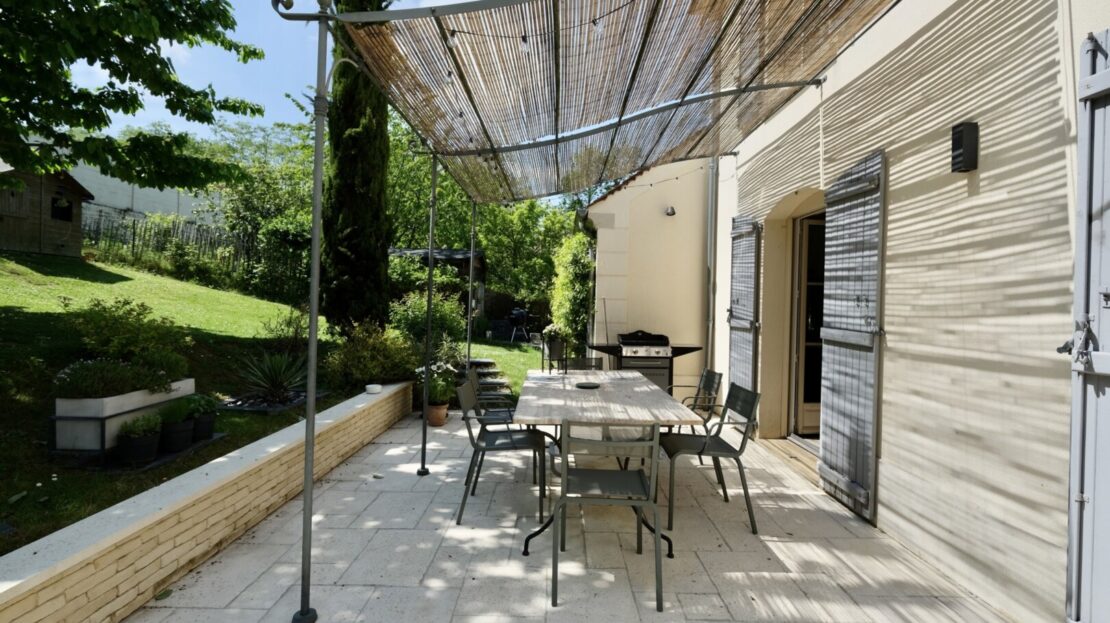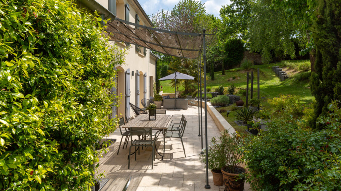 Les espaces extérieurs sont aussi soignés que l’intérieur de la maison ! paysagés, arborés (cerisier, pommier, noisetier…) on a ici plusieurs zones de détente, jeux et surtout le charme d’une terrasse exceptionnelle agrémentée d’une pergola.