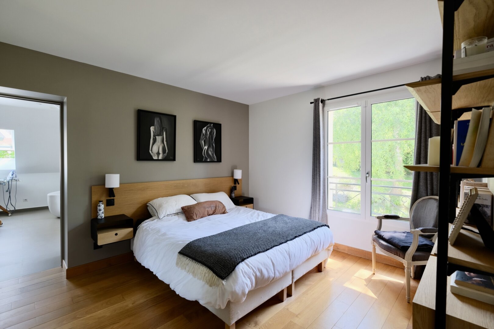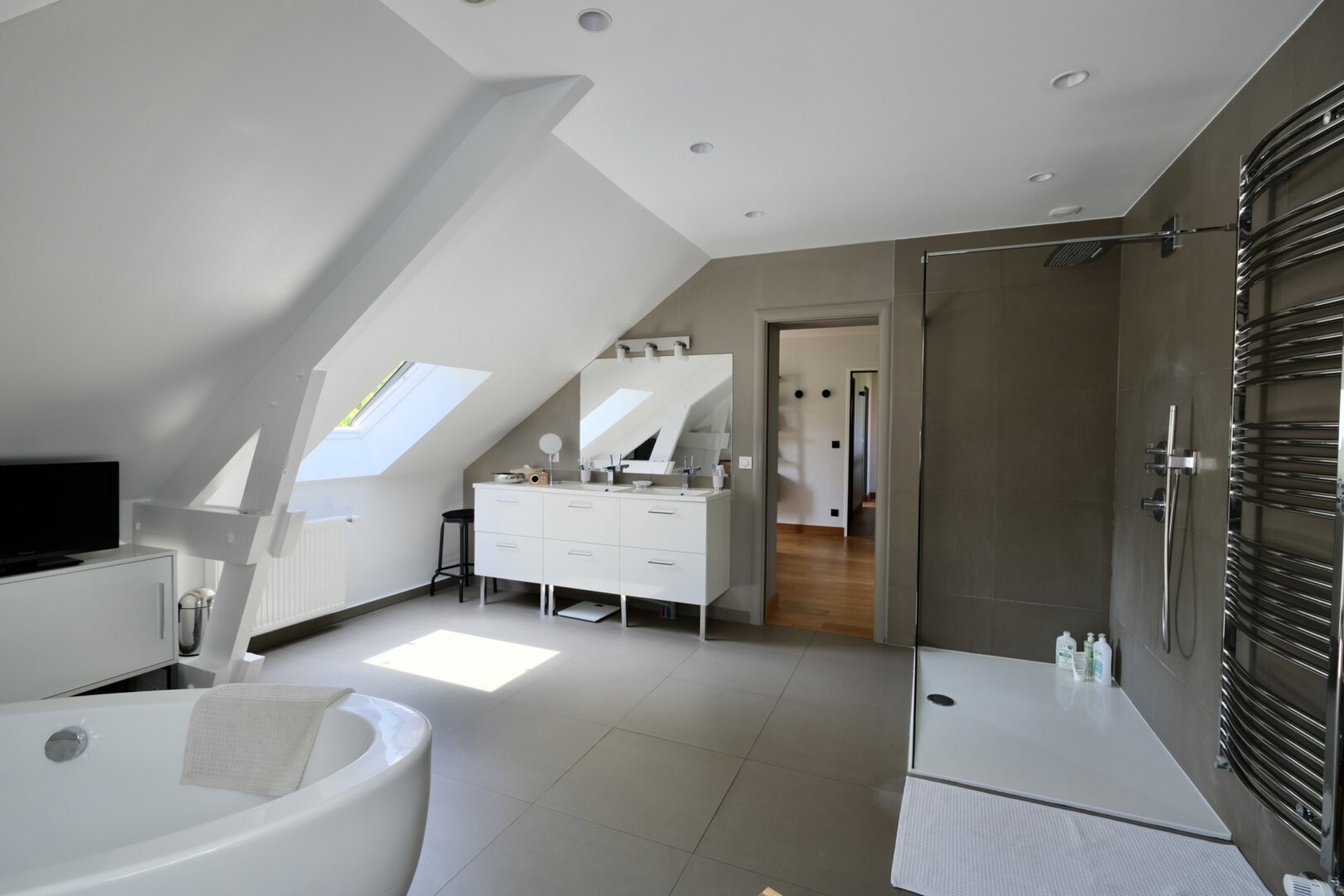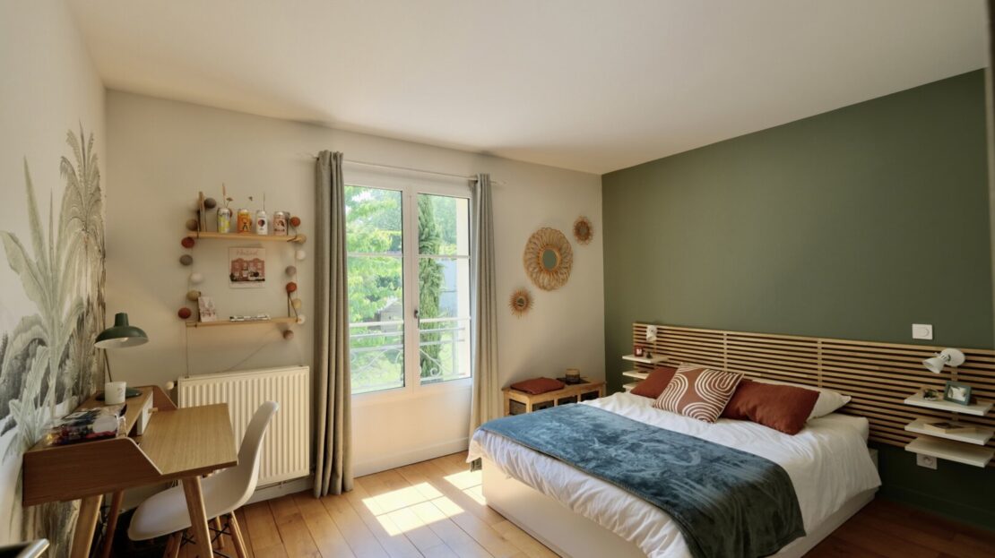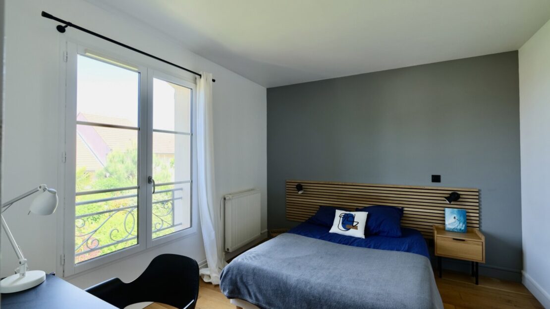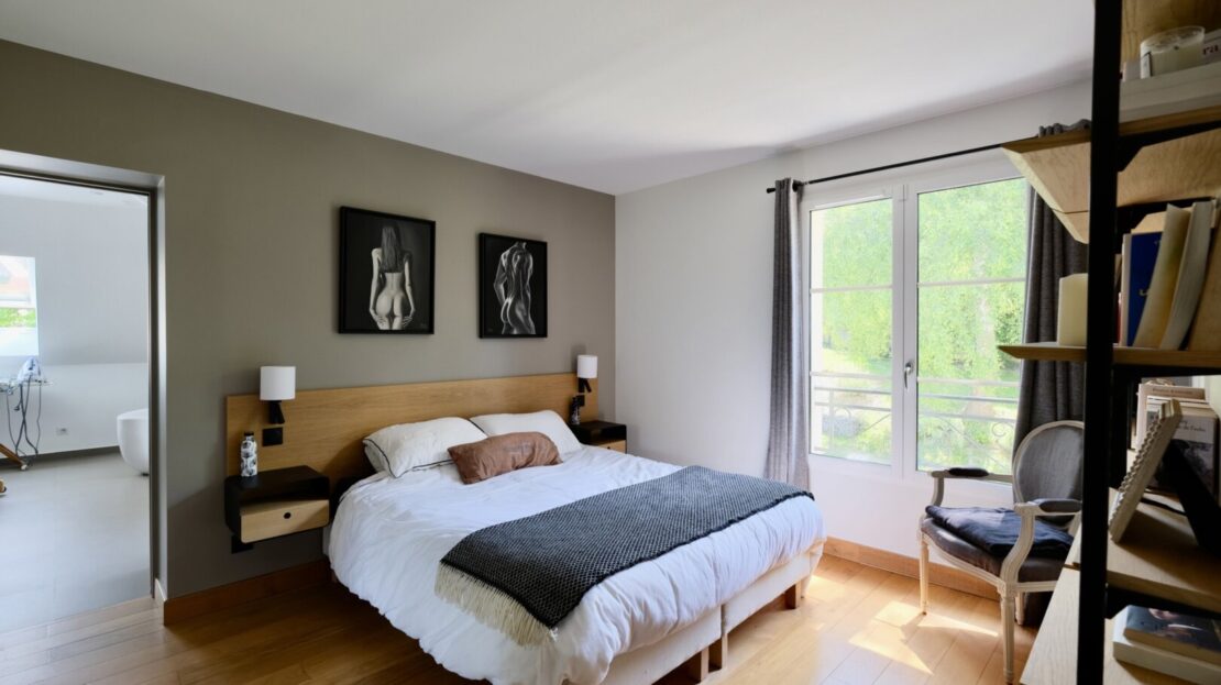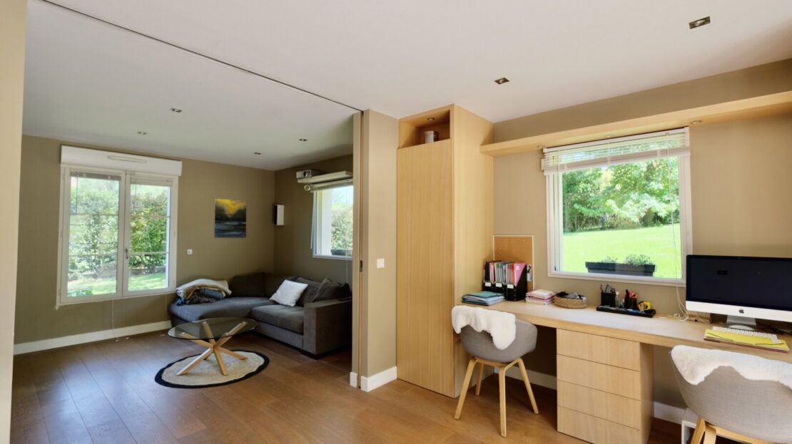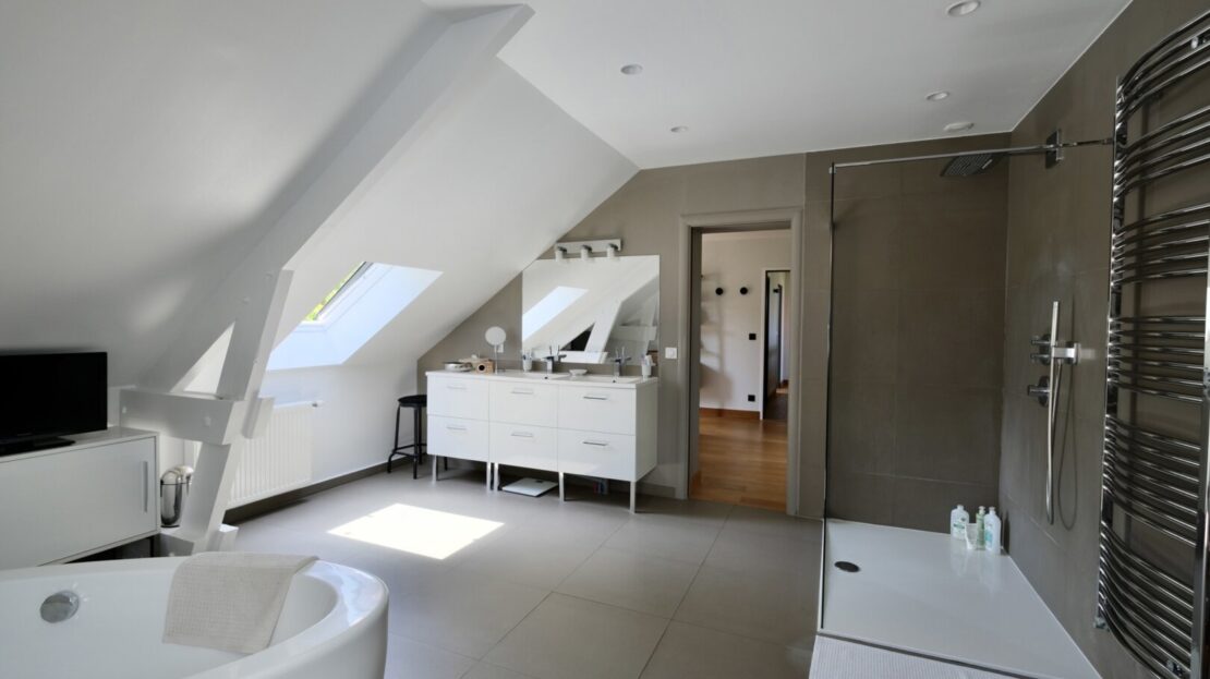 Le 1er étage offre 3 belles chambres, 2 salles d’eau, un wc, une buanderie et un superbe espace parental privatif comprenant une chambre, et une très grande salle de bain-douche et wc suffisamment grande pour en faire une petite salle de sport !
