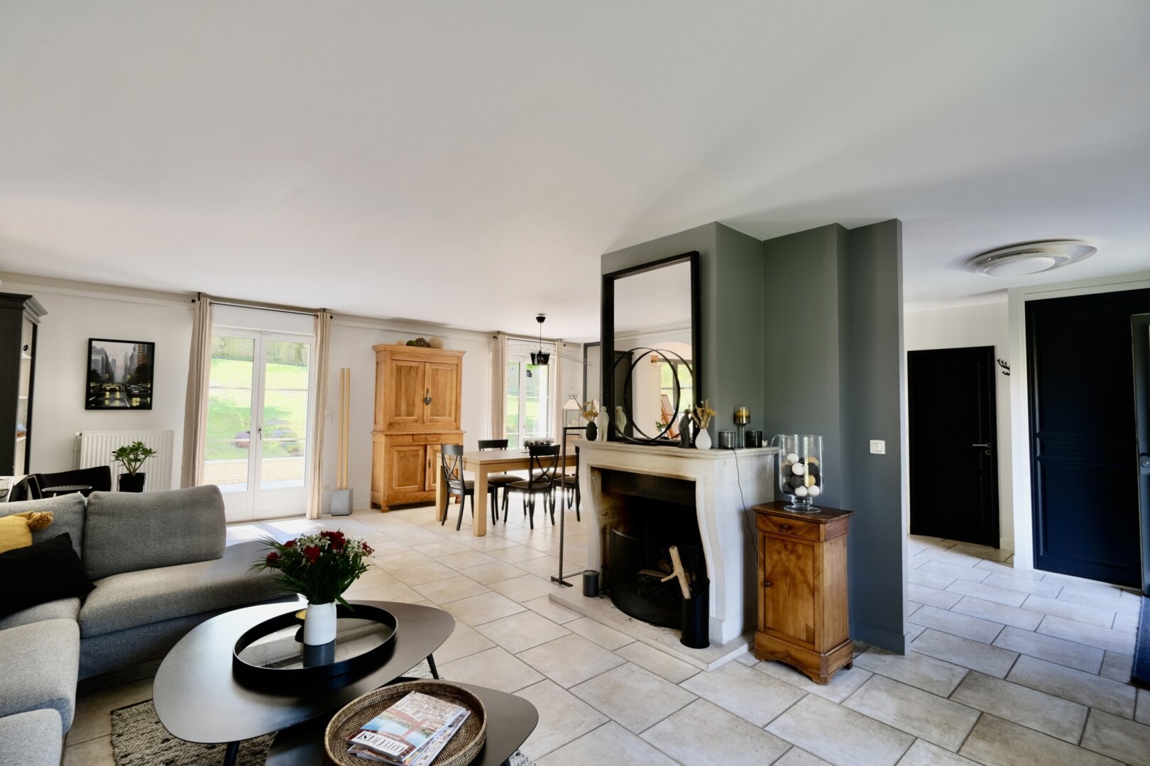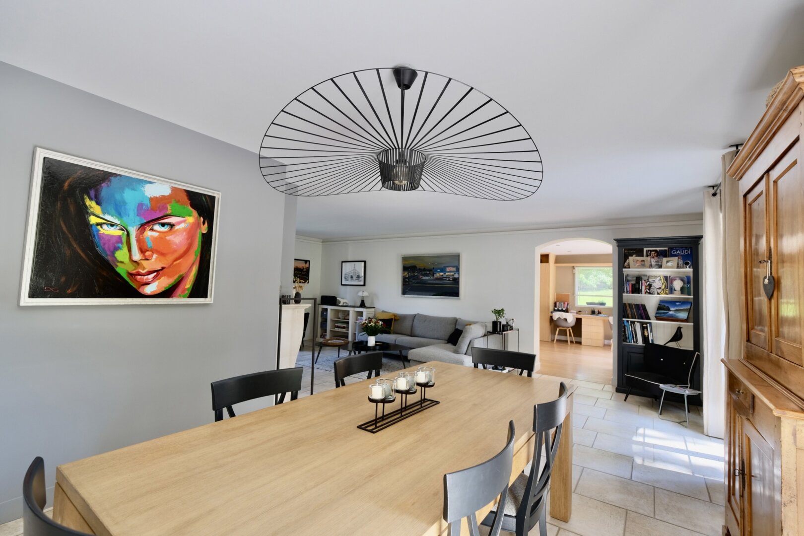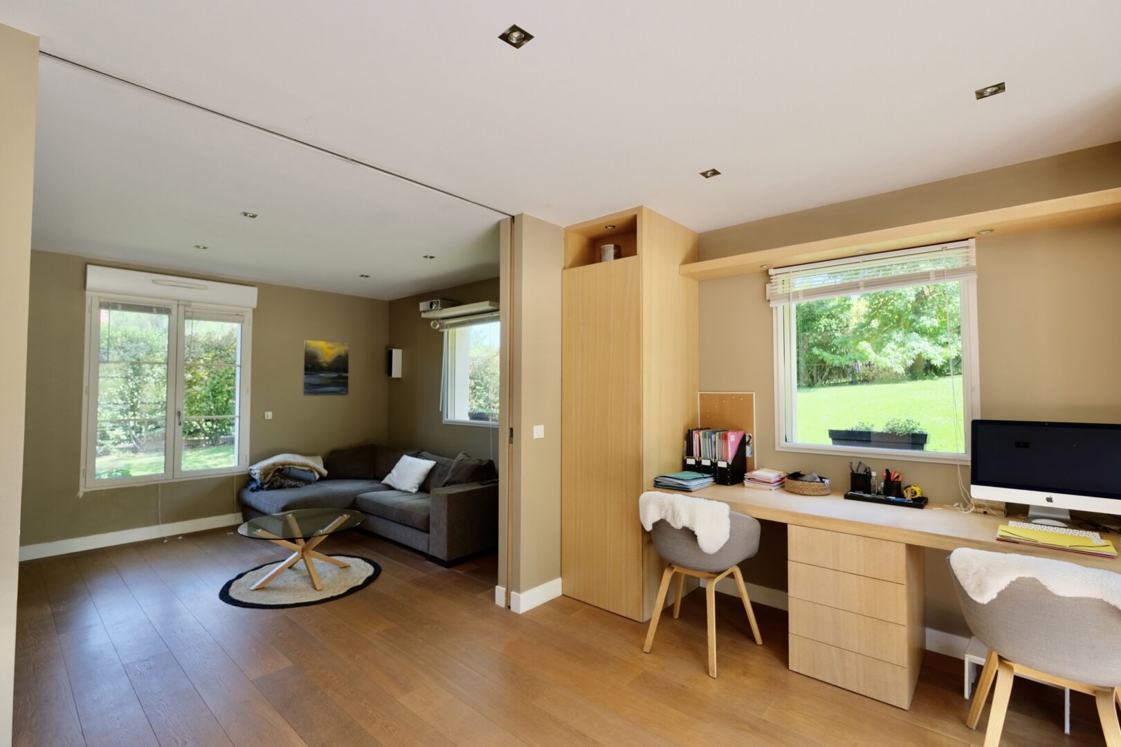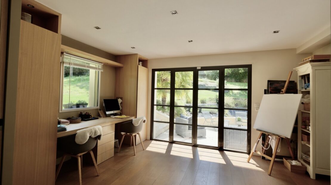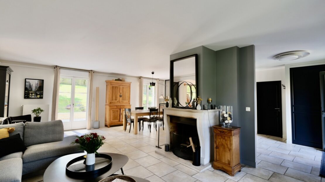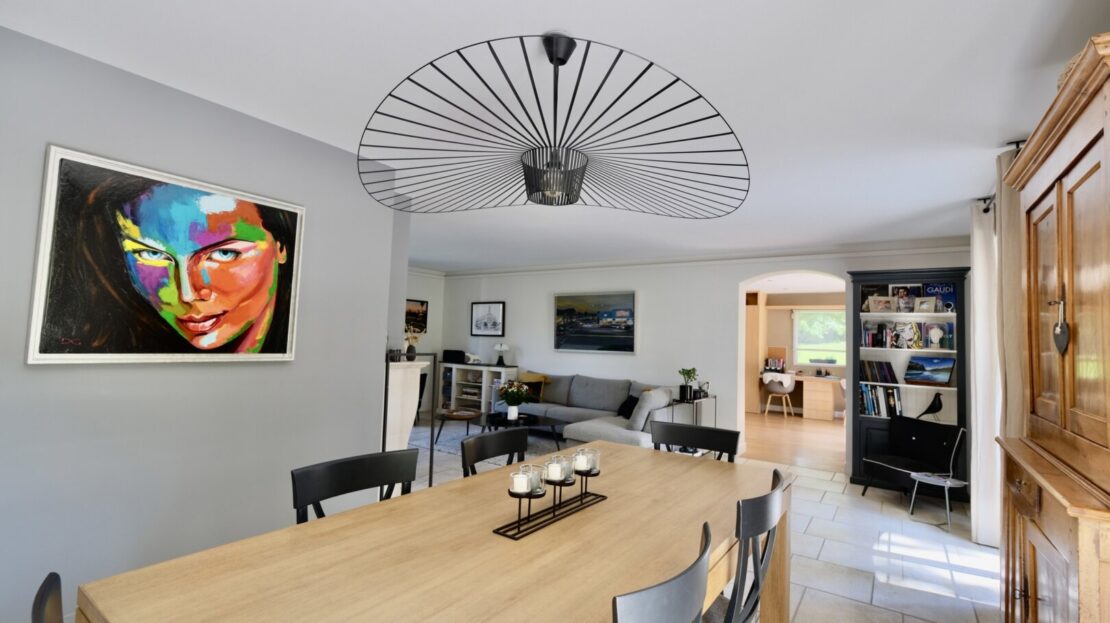 Édifiée en 2005, sur un terrain de 1187 m2, dans un environnement calme, près des vergers et de la forêt, la maison à la décoration contemporaine et de goût développe une surface de 230 m2 et beaucoup d’espaces pour toute la famille : dès l’entrée on embrasse un superbe escalier et les espaces de vie : un salon avec cheminée, un espace dînatoire prolongé par une superbe cuisine de belle facture sur mesure (piano de cuisson Lacanche), l’ensemble donne de plain-pied sur la terrasse et le jardin exposé sud-ouest. Le salon est complété par un superbe espace multi fonctions, aménagé en bureau avec vue sur le jardin et salon cosy TV. Au rez-de-chaussée, on trouve aussi une chambre ou bureau et un wc.