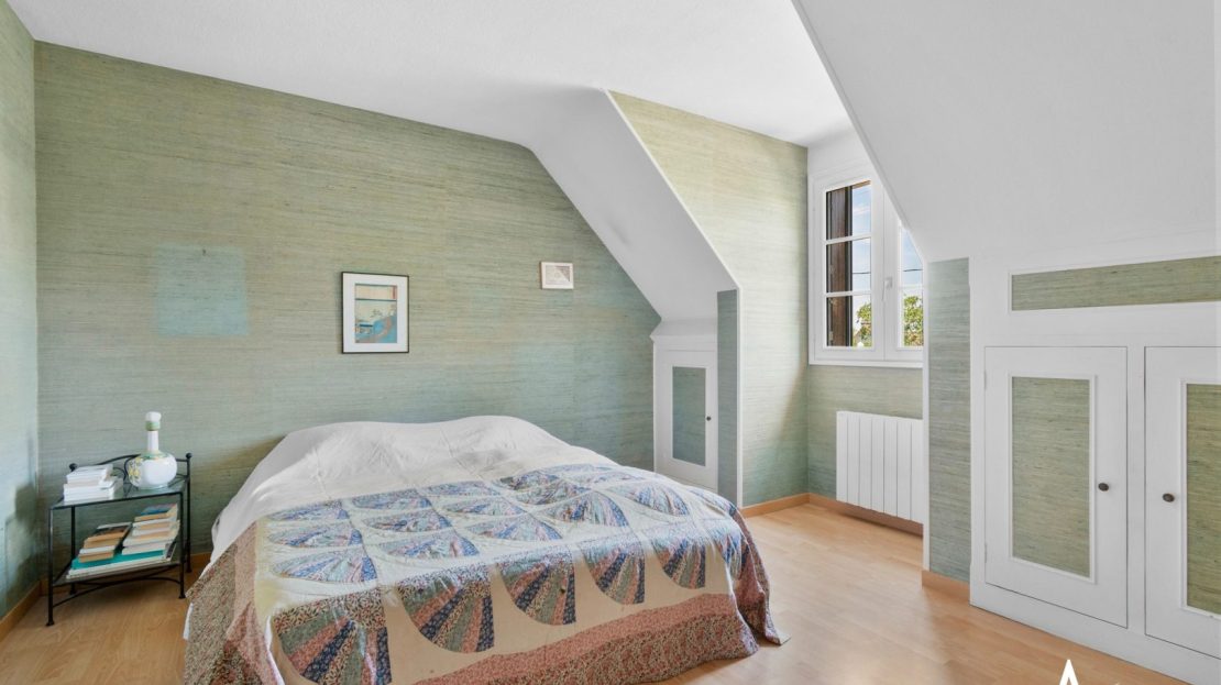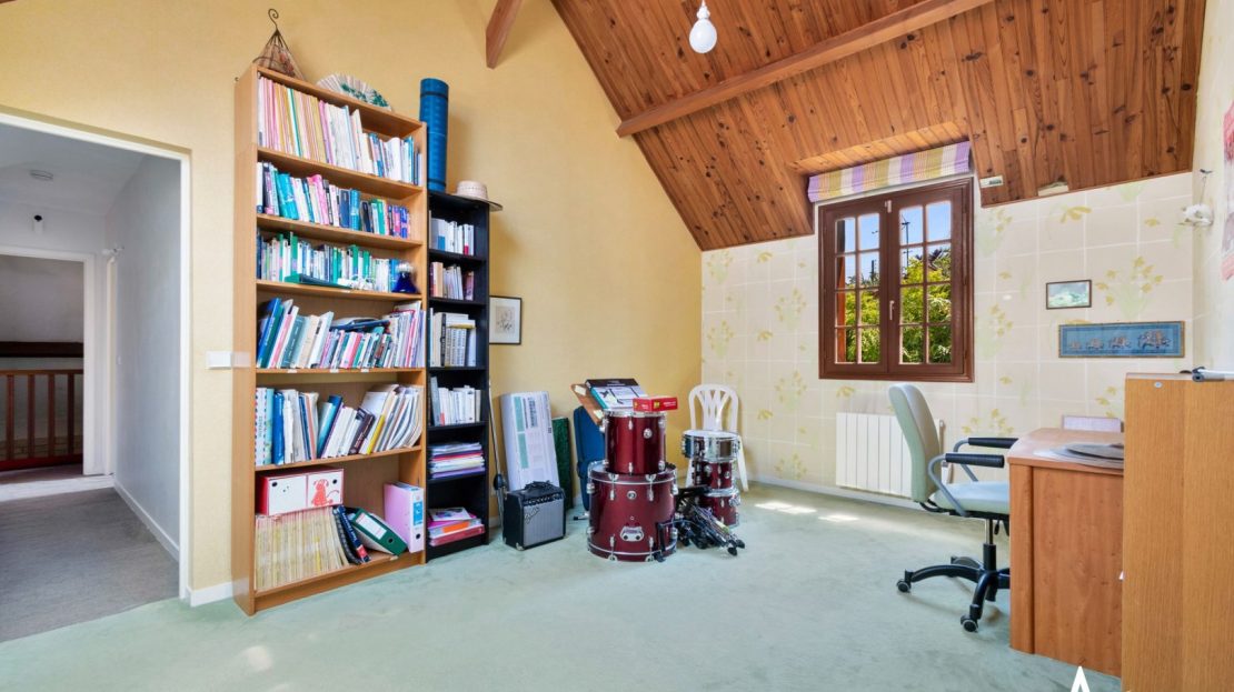 Le palier du 1er étage distribue 1 chambre parentale, une grande salle de bains, un wc, et 3 autres chambres dont 1 très grande, avec hauteur cathédrale.