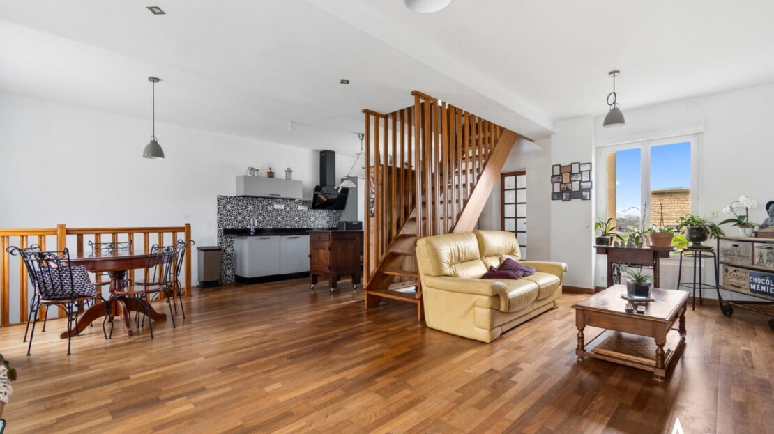 Le rez-de-chaussée surélevé accueille un grand séjour de 58 m², baigné de lumière naturelle grâce à sa double exposition. L’espace salon et salle à manger, d’une grande convivialité, est complété par une cuisine ouverte, créant un ensemble harmonieux et chaleureux avec son parquet et son escalier en bois.