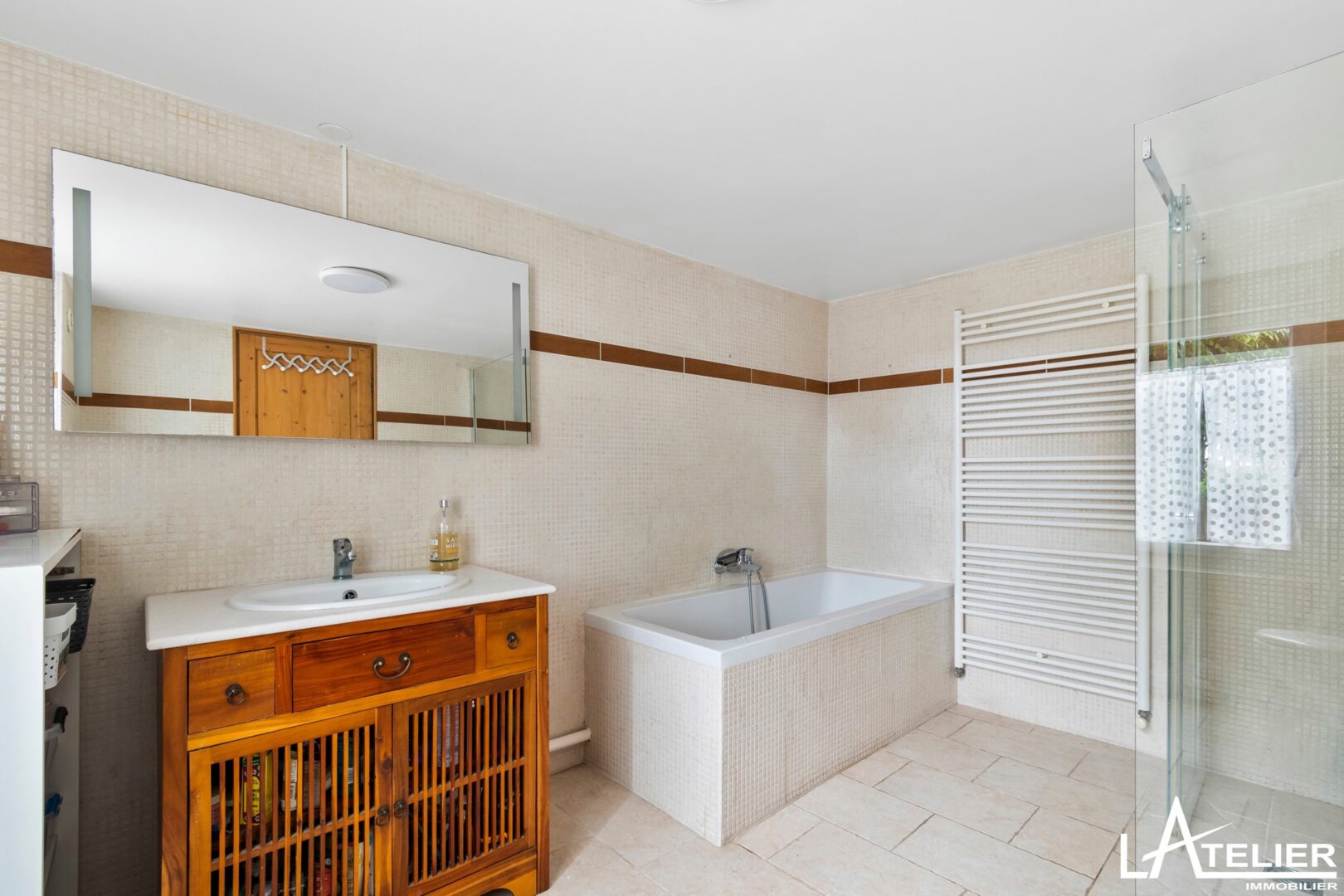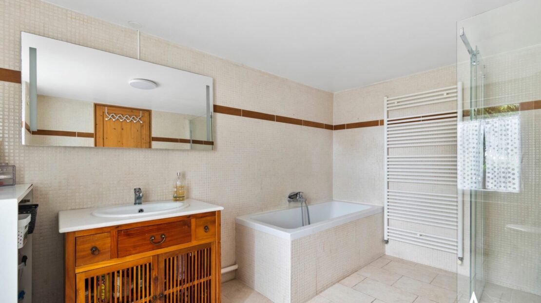 Au rez-de-jardin, vous trouverez un espace idéal pour l’intimité parentale, composé d’une chambre et sa propre salle de bain, d’un grand dressing ainsi qu’un espace bureau et une buanderie/chaufferie.