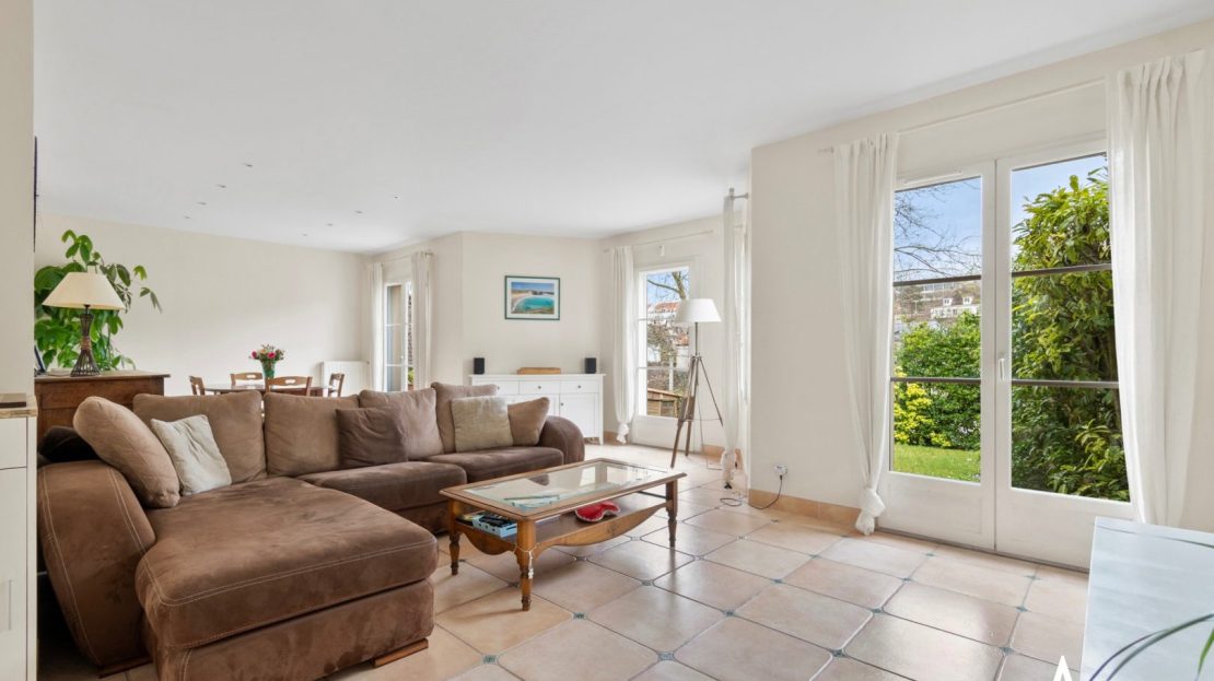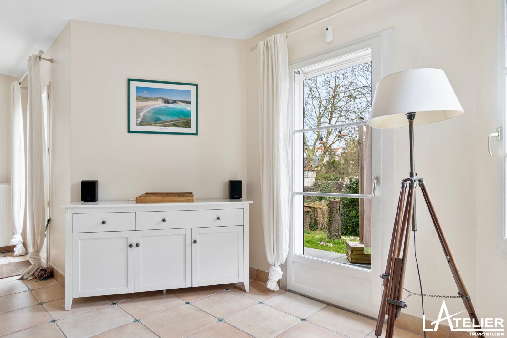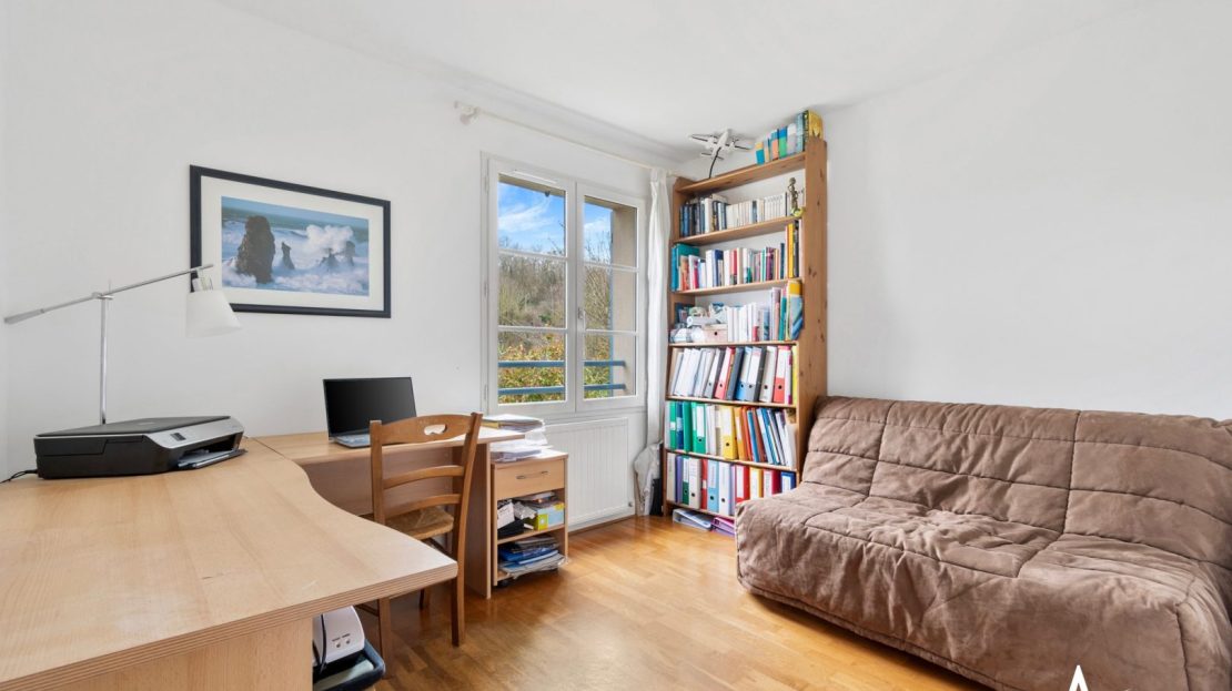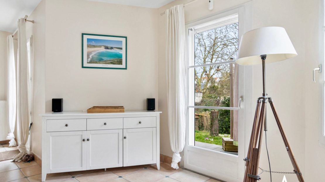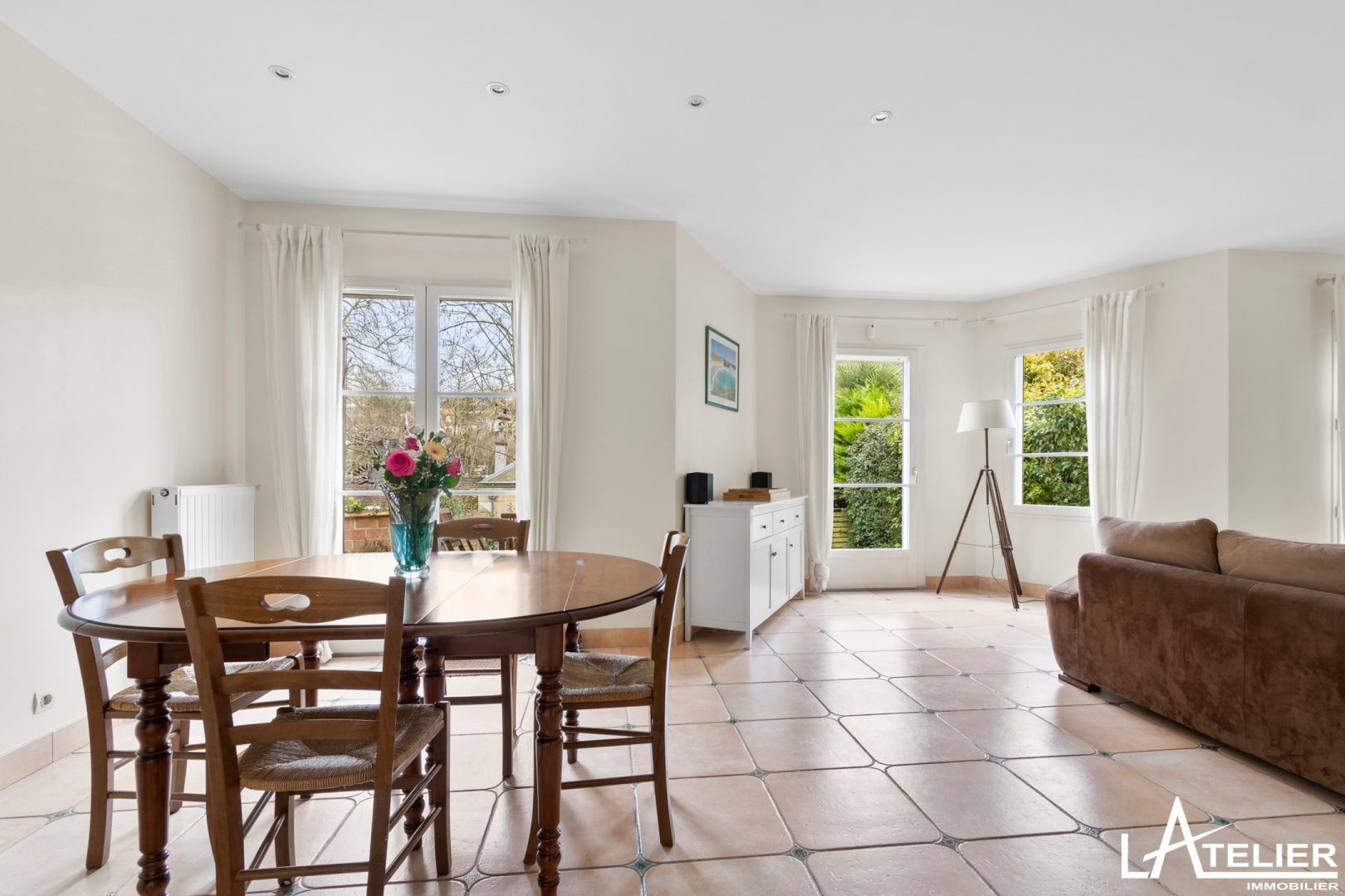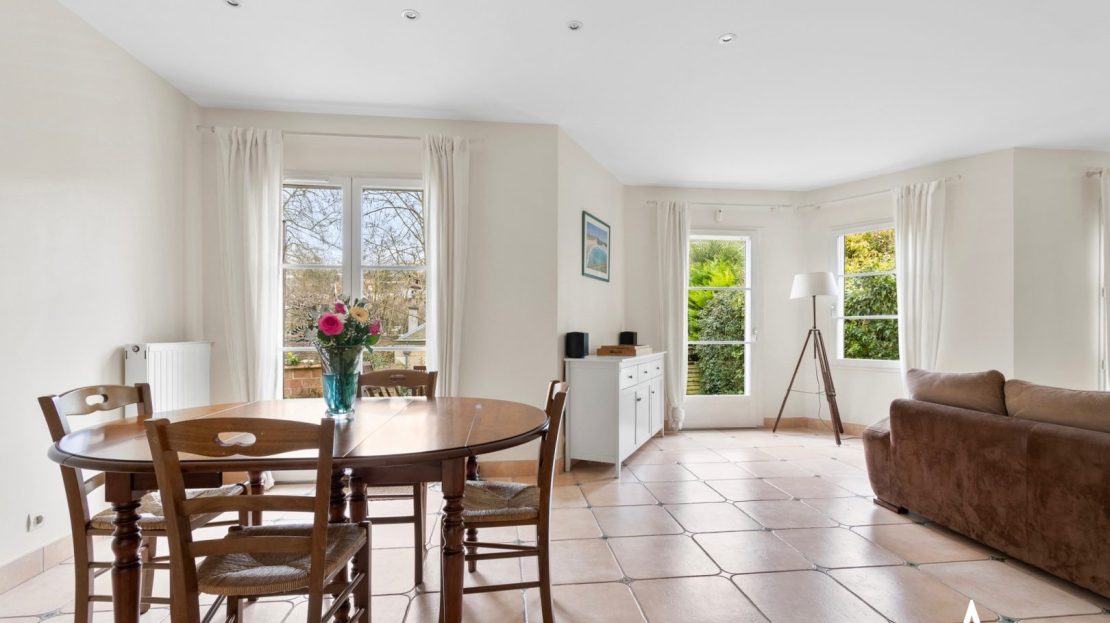 Dès l’entrée, un espace modulable s’ouvre à vous, idéal pour un bureau ou un coin lecture, avant de mener vers un vaste séjour baigné de lumière. Son bow-window apporte du cachet et prolonge la vue vers la jolie terrasse qui vous invite à profiter de l’extérieur. Dès le printemps, elle se fond dans un écrin de grands arbres qui lui confèrent une atmosphère paisible et rafraîchissante. La cuisine, attenante à la salle à manger, peut être ouverte sur le séjour pour encore plus de convivialité.
