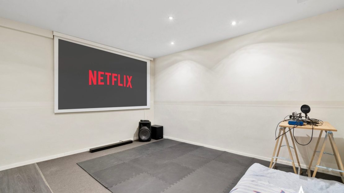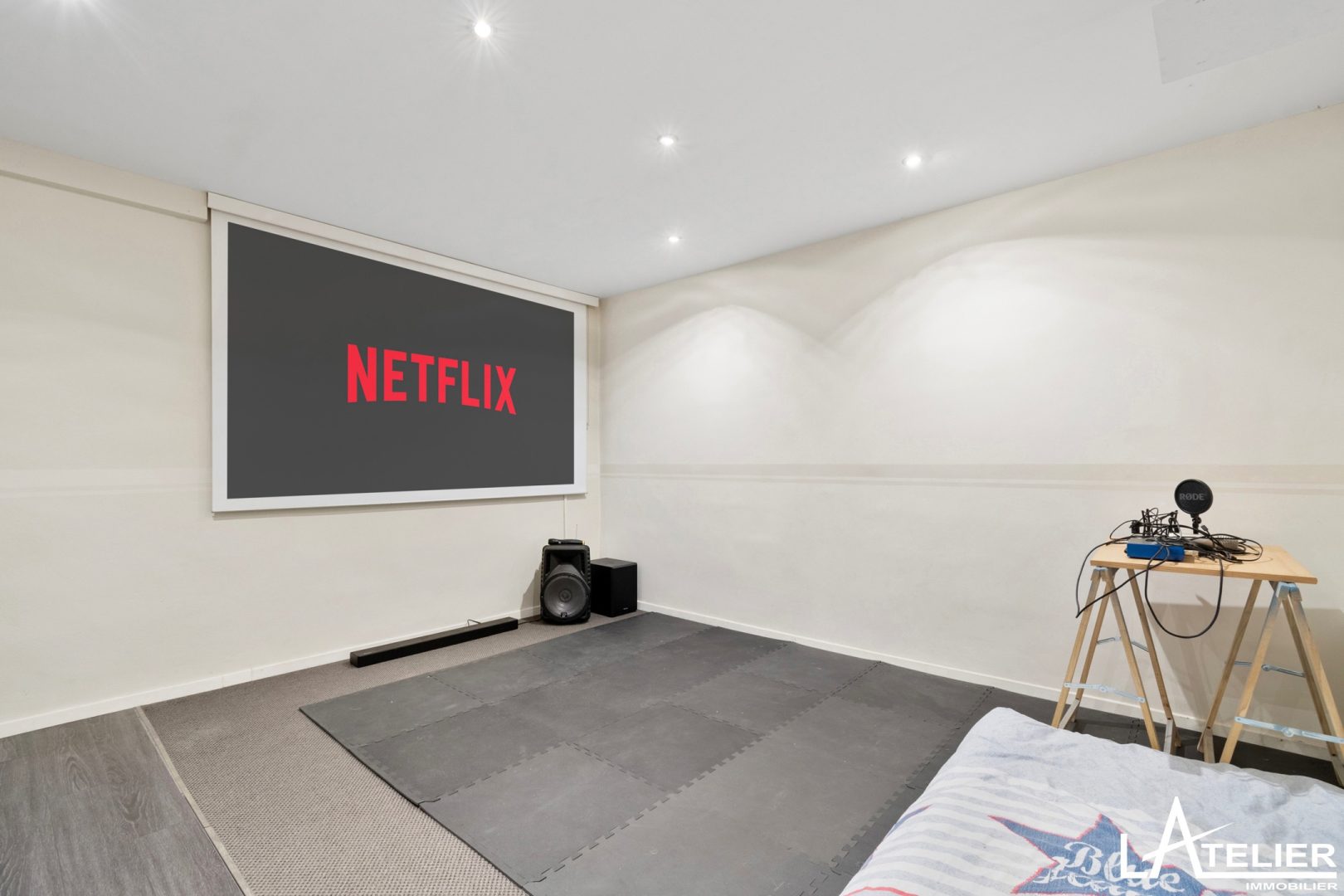 Au sous-sol, le garage avec un espace atelier peut accueillir au moins une voiture et de nombreux vélos. Un espace de stockage et une pièce supplémentaire permettent de s’adapter à vos besoins. En bonus, une salle de cinéma a été créée, c’est le lieu idéal pour les soirées en famille.