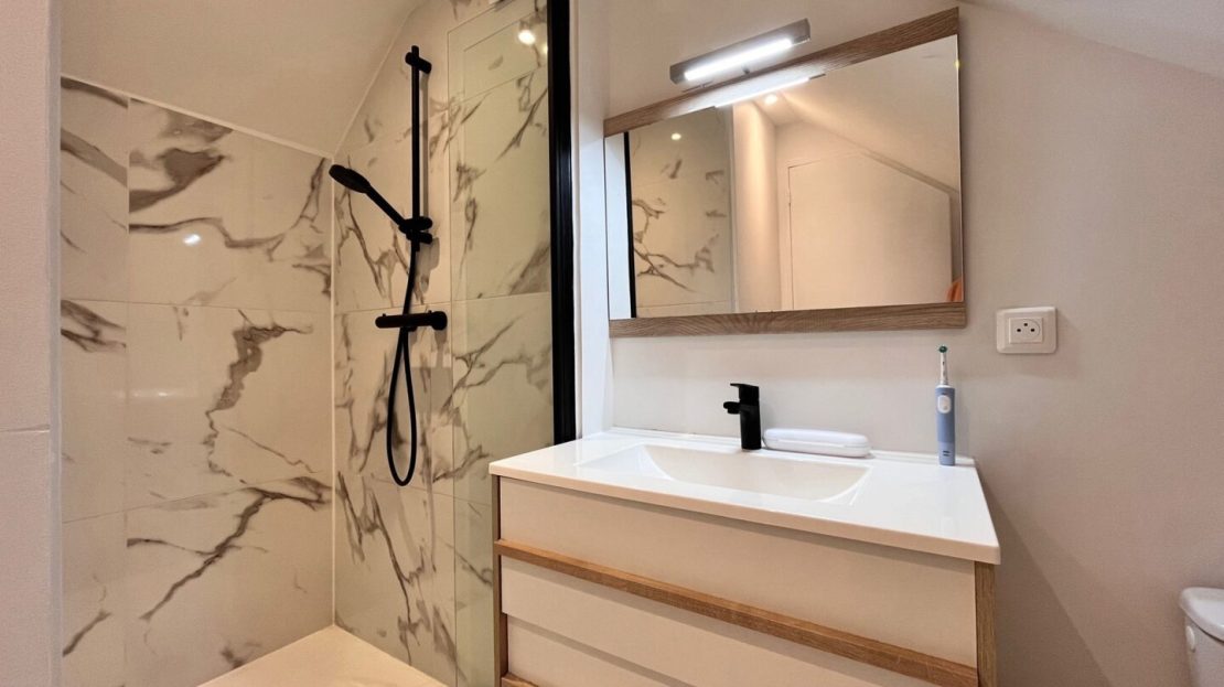 Au 1er étage, une suite parentale avec salle de bain privative et dressing, 2 chambres et une salle de douche complémentaire pour le confort de chacun ; au 2ème étage, 2 chambres complémentaires mansardées, idéales pour les enfants ou pour un bureau, avec le privilège de la vue mer, ainsi qu’à ce niveau une salle de douche élégante en parfait état.