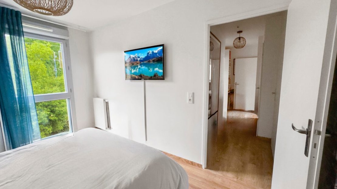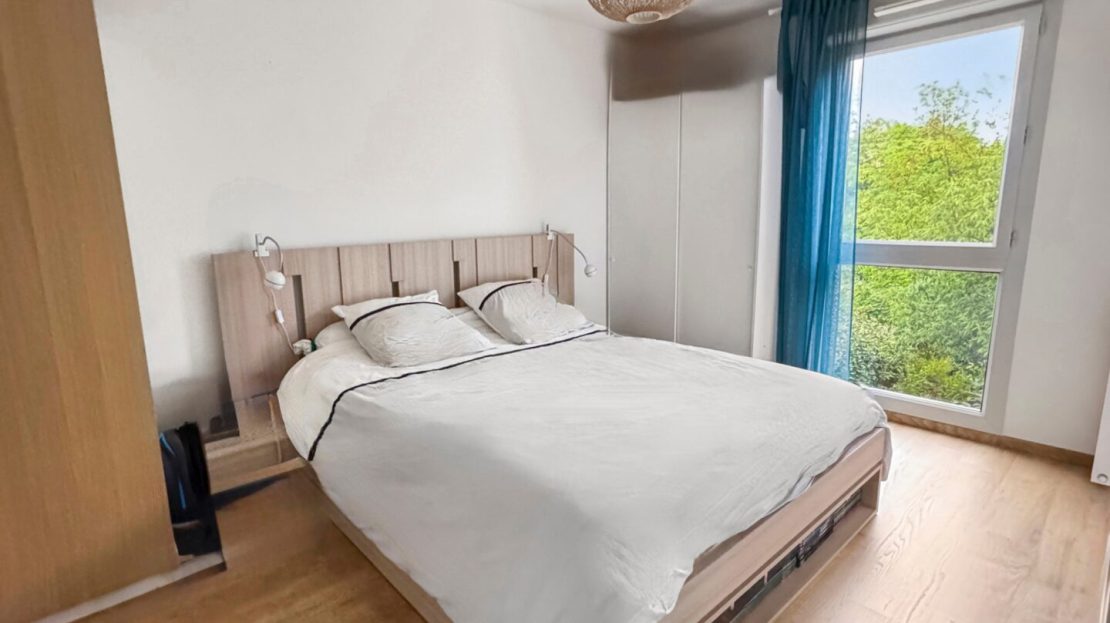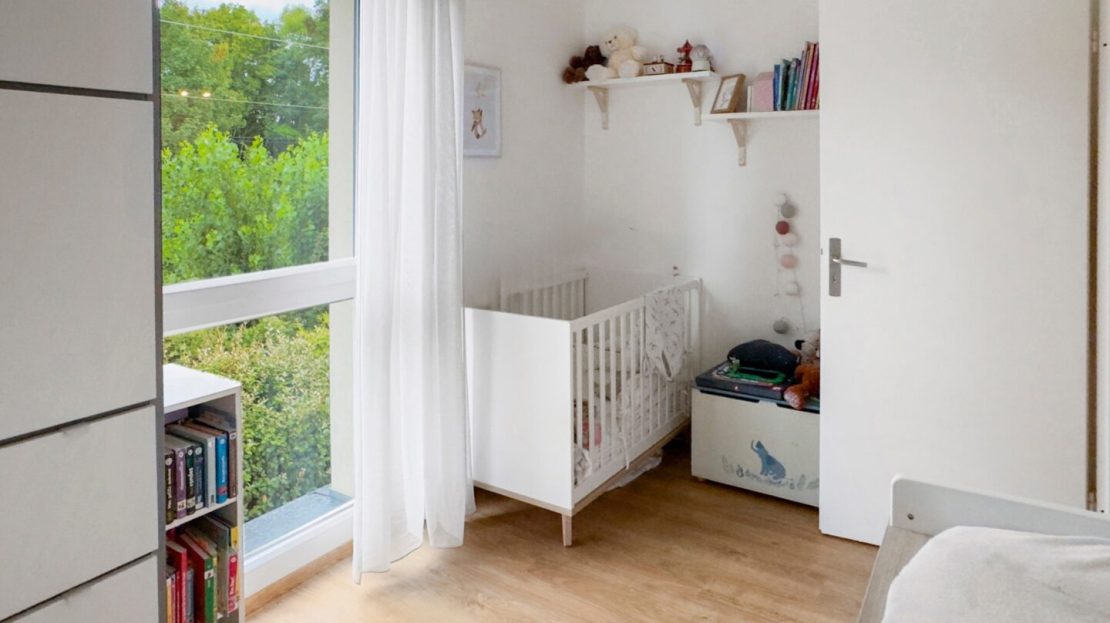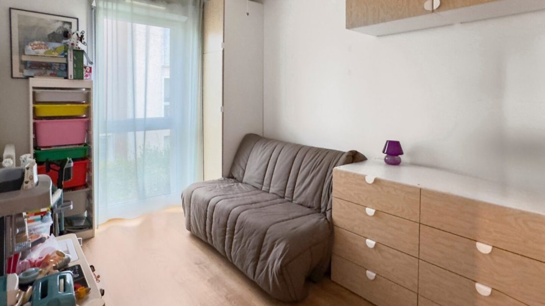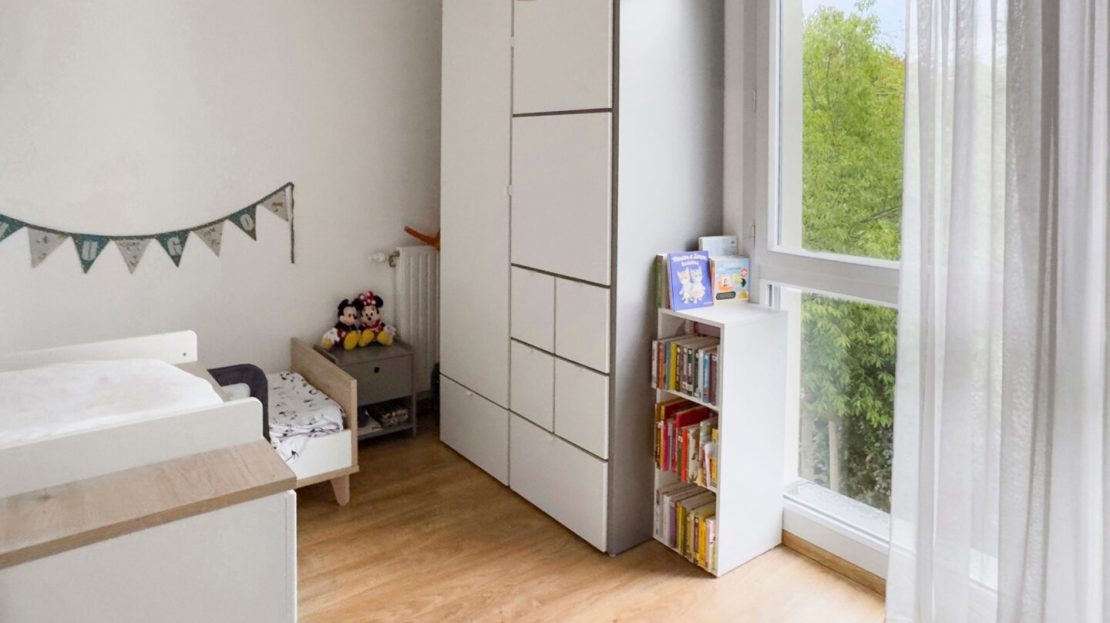 Une 1ère chambre (avec rangement intégré) est accessible par le salon (idéal bureau ou chambre d’amis), puis un dégagement « nuit » dessert une autre chambre, un wc séparé, une grande salle de bains / buanderie avec beaucoup de rangements, et un espace parental avec chambre et salle d’eau privative.