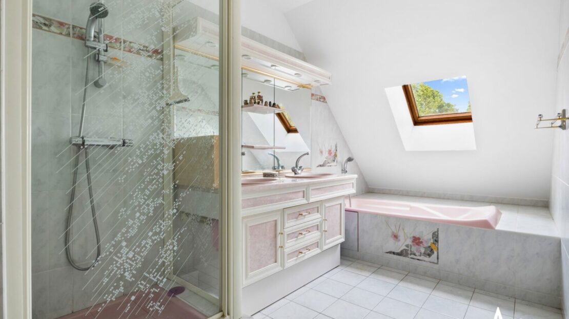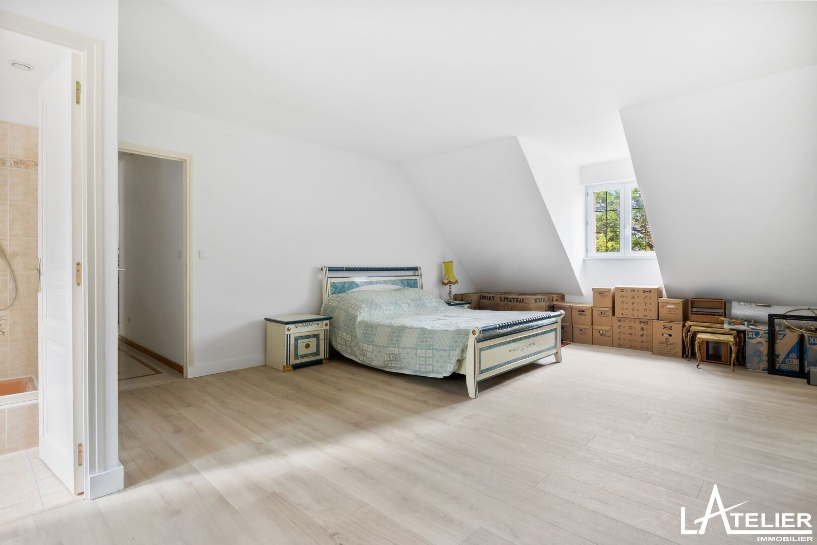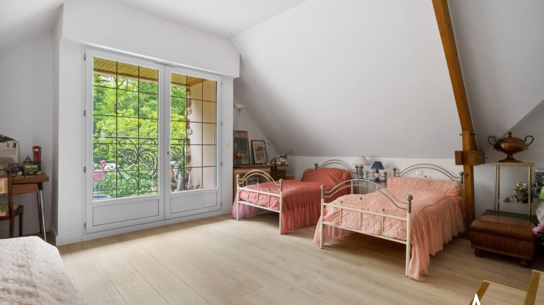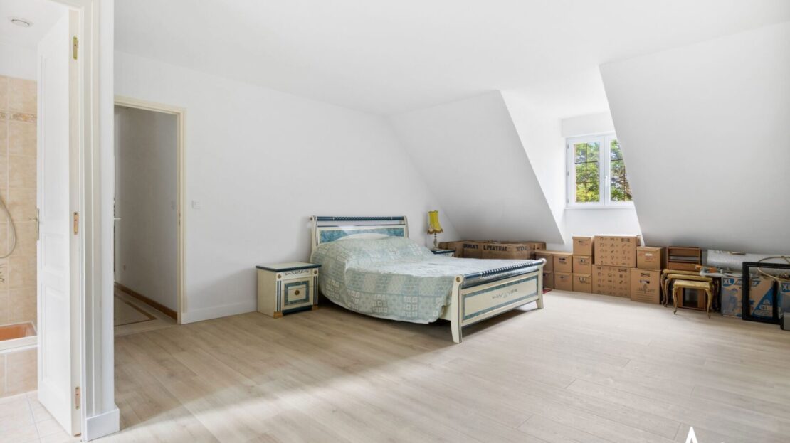 A l’étage, le palier dessert 3 grandes chambres de 16, 20 et 40 m2 ainsi que 2 salles de bain. Au dessus, les combles sont aménageables.