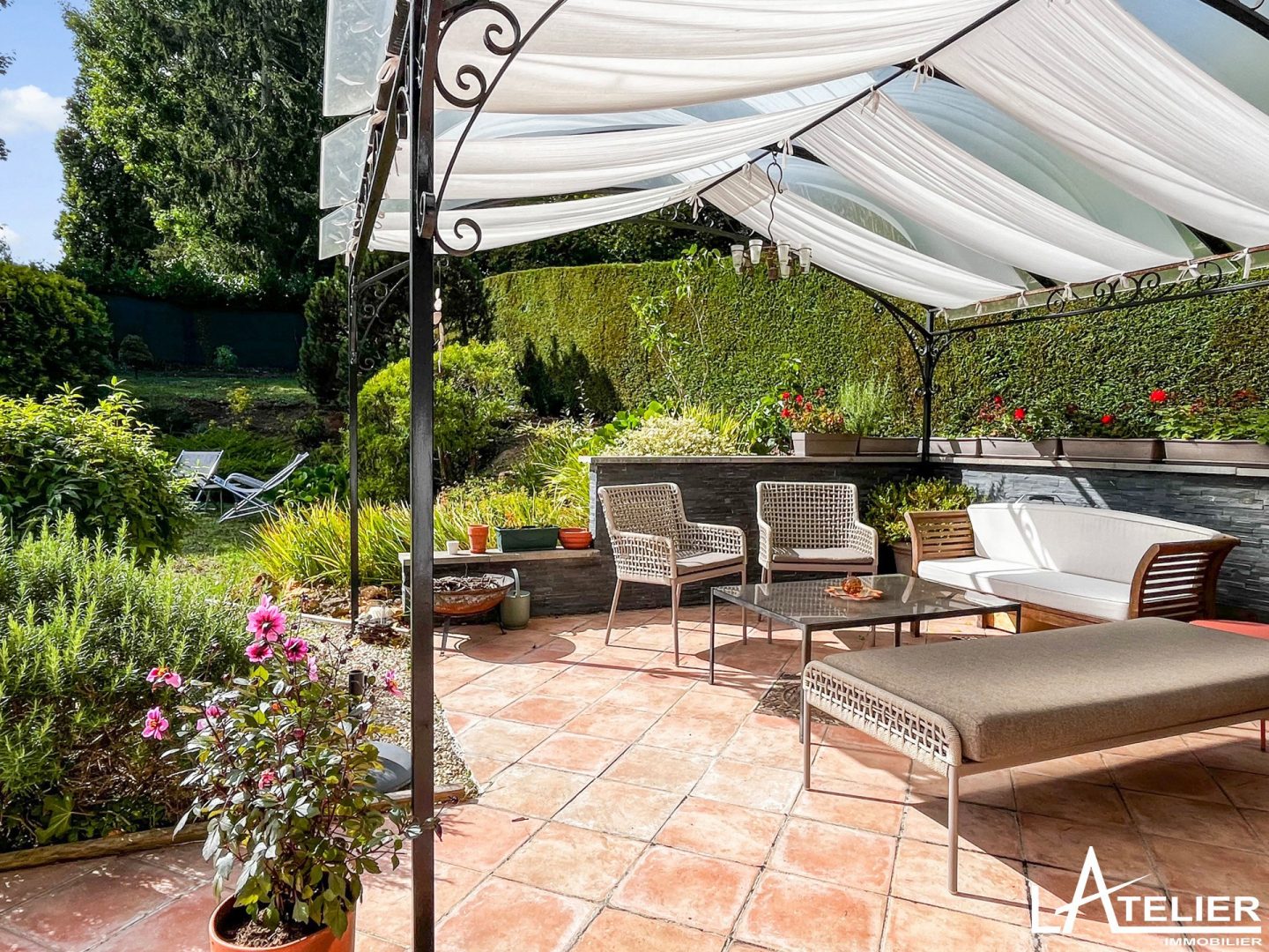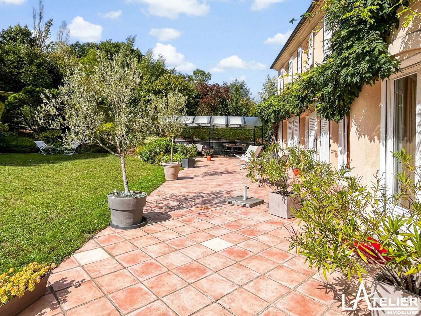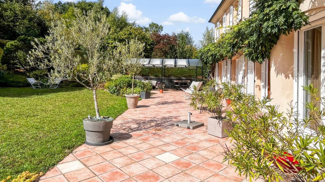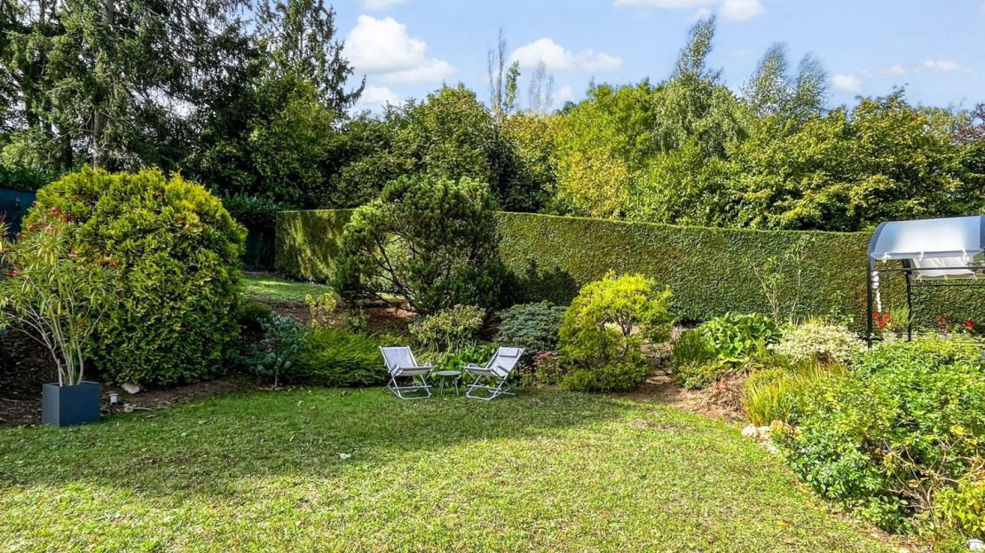 Le jardin paysagé et arboré fait le tour de la maison et offre plusieurs zone de détente et jeux. La grande terrasse ensoleillée dans le prolongement des pièces de réception se poursuit par un joli espace ombragé sous une tonnelle.
