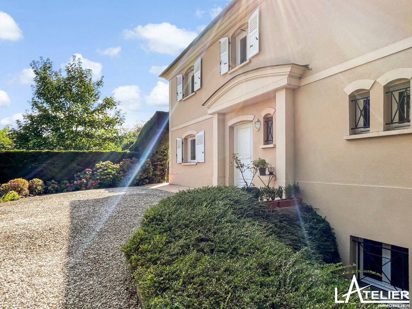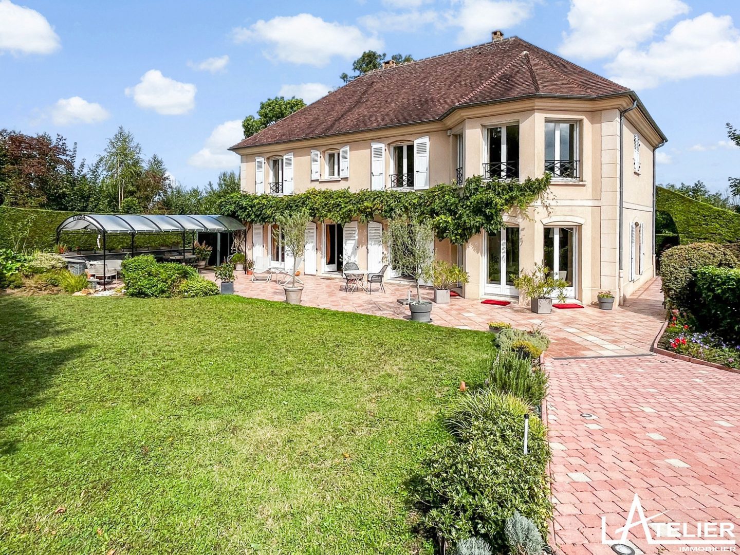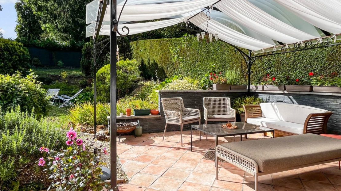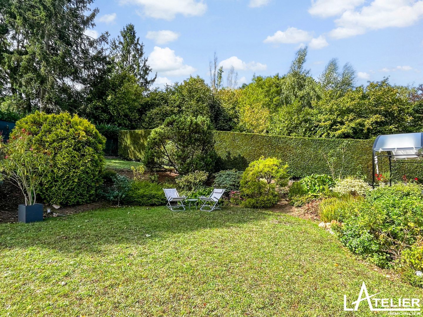 Le jardin paysagé et arboré fait le tour de la maison et offre plusieurs zone de détente et jeux. La grande terrasse ensoleillée dans le prolongement des pièces de réception se poursuit par un joli espace ombragé sous une tonnelle.