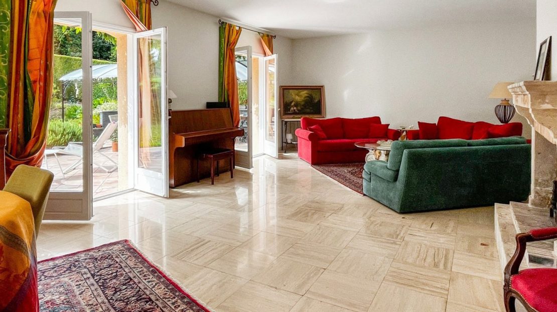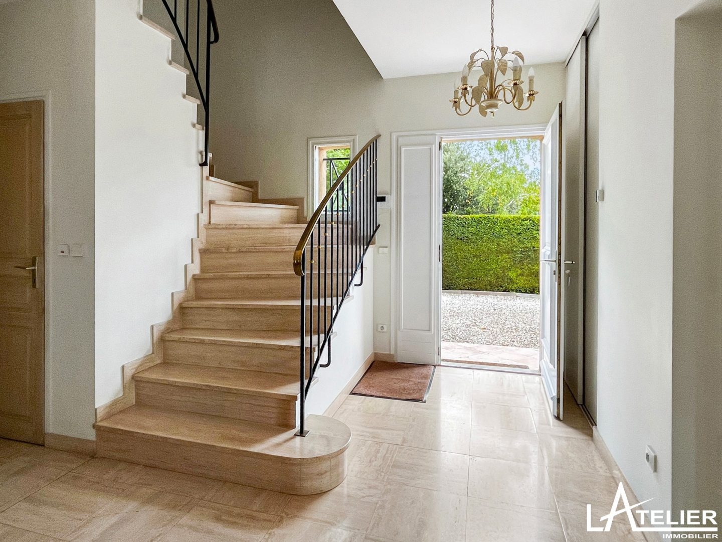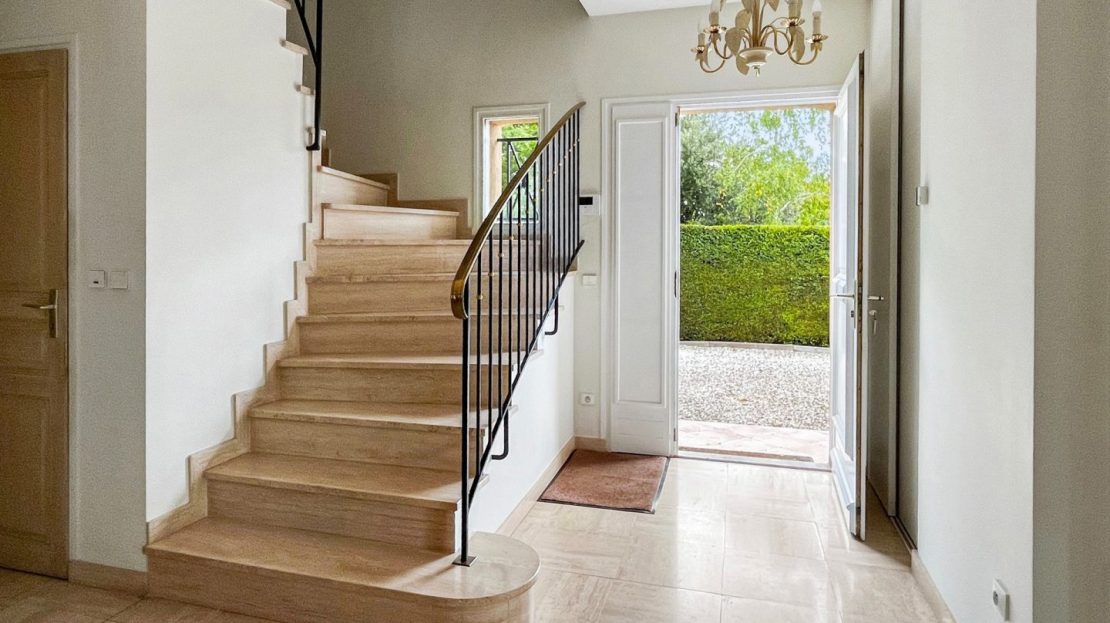 Le hall d’entrée majestueux avec hauteur cathédrale et superbe escalier en travertin, distribue aussi un premier espace nuit avec chambre, salle d’eau privative, et un wc réception.