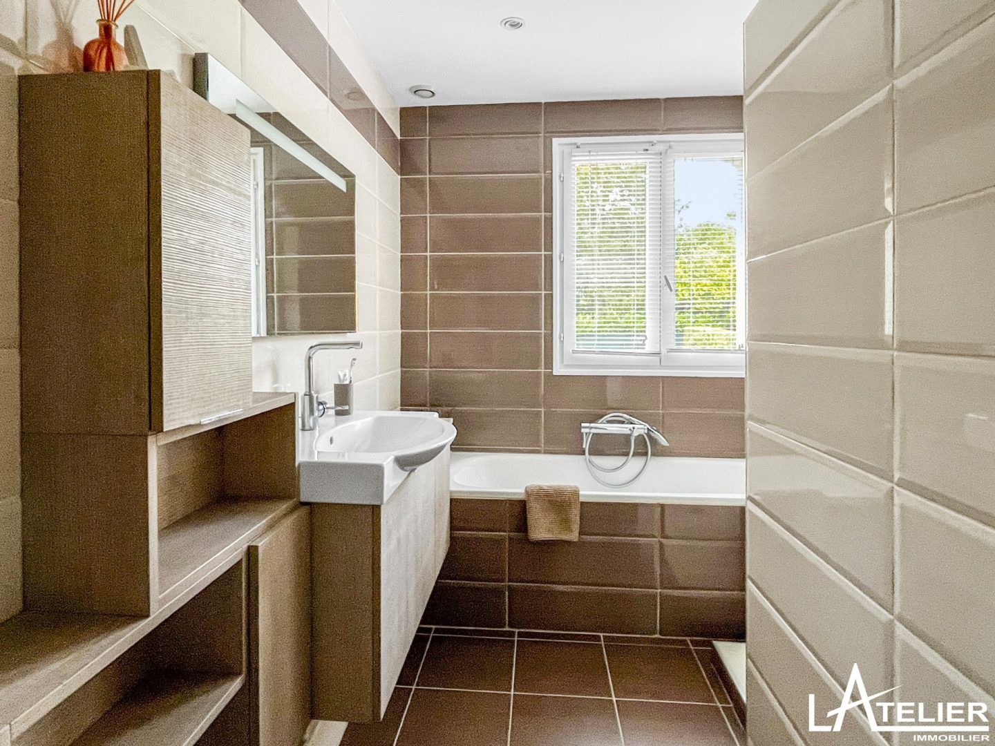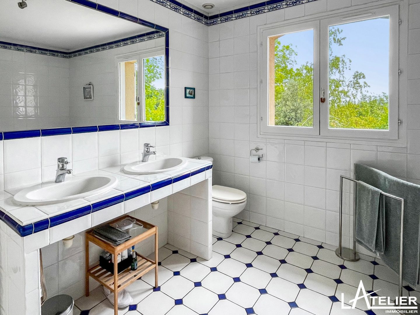 Le sous-sol total est propre et carrelé, comprend un double garage, une grande buanderie, une cave à vin. Un studio « indépendant » y est également aménagé avec kitchenette, salle d’eau et wc (espace nounou « au pair’ ou invités).
