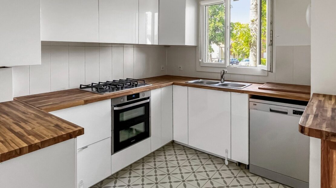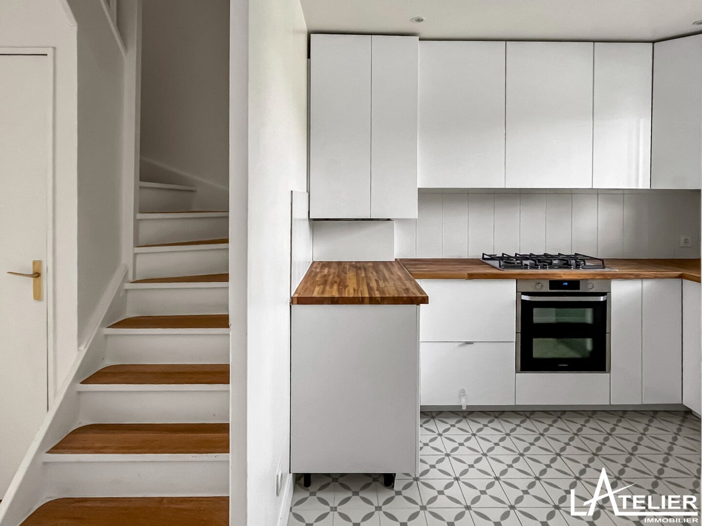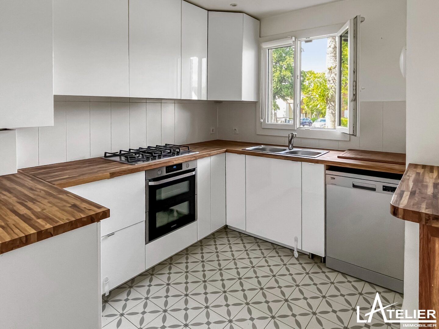 L’entrée ouvre sur la cuisine, joliment aménagée et équipée, et sur la pièce de vie donnant de plain-pied sur la terrasse et le jardinet. Wc séparé.