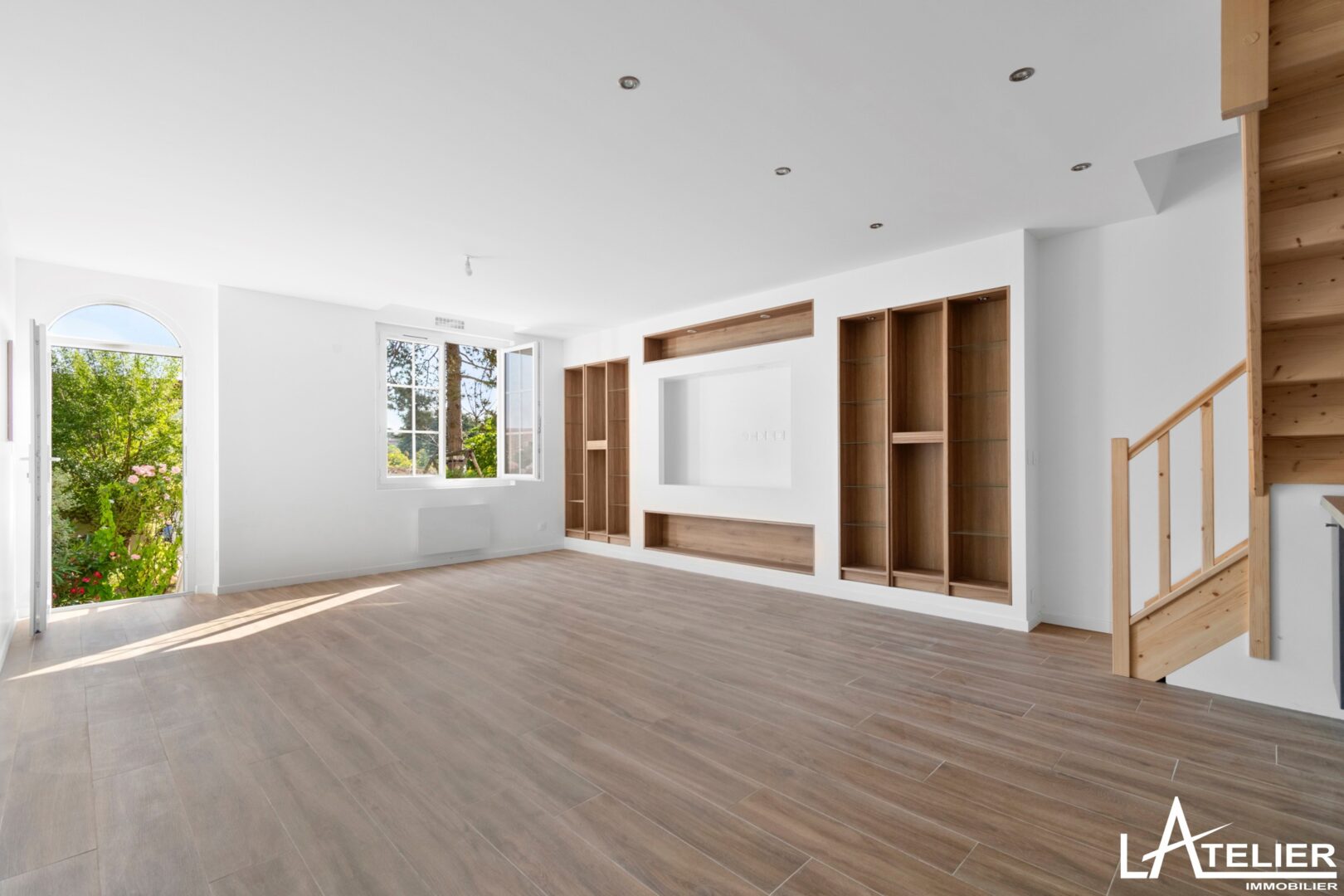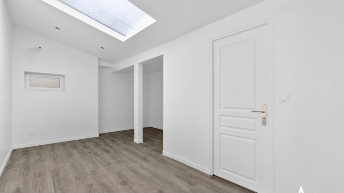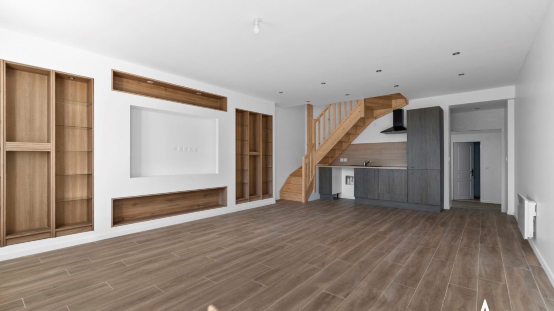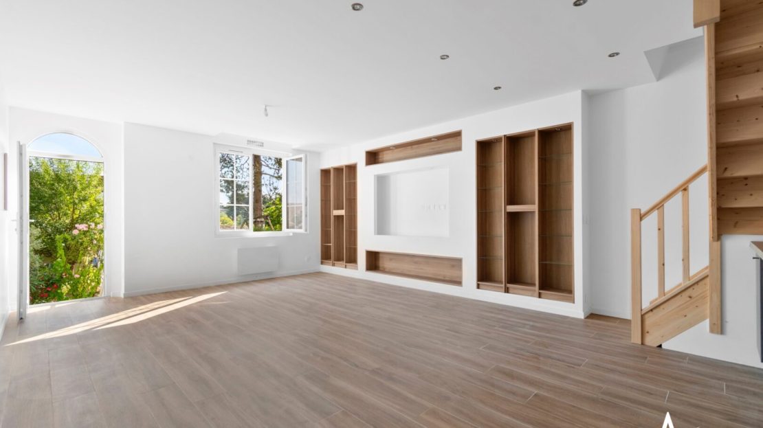 Le rez-de-chaussée surélevé propose une pièce de vie de 31 m² lumineuse, avec un agencement déjà pensé pour un coin salon / TV et l’espace repas.
