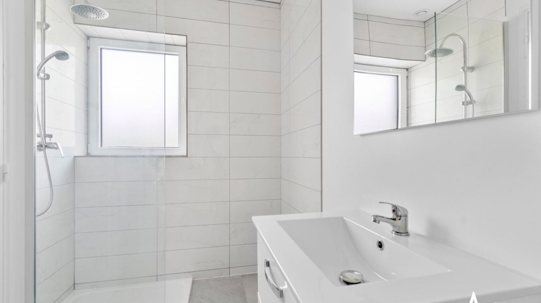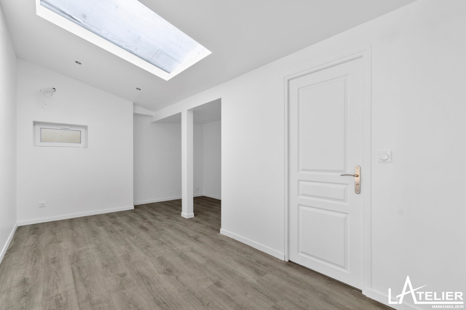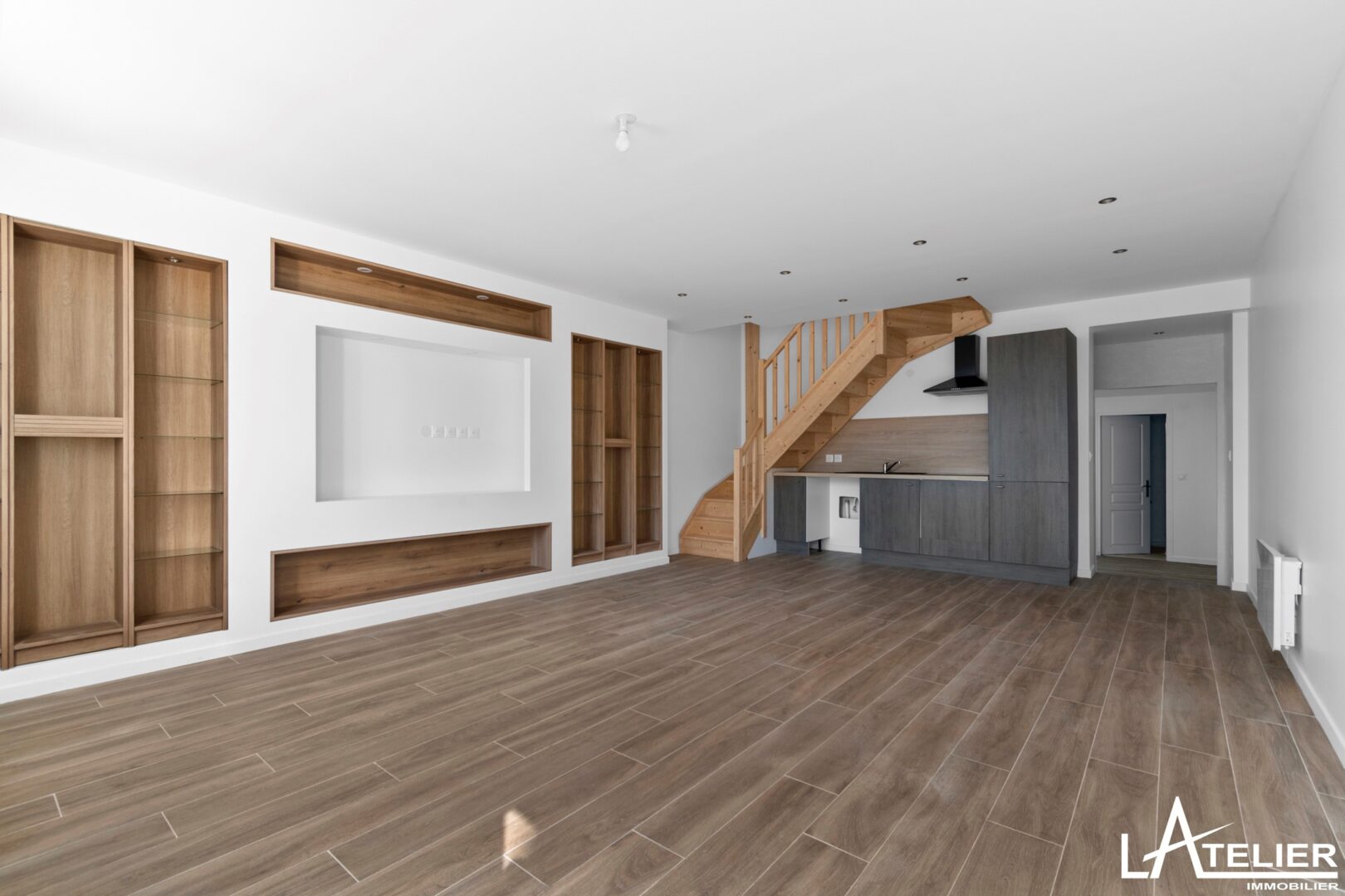 Le rez-de-chaussée surélevé propose une pièce de vie de 31 m² lumineuse, avec un agencement déjà pensé pour un coin salon / TV et l’espace repas.