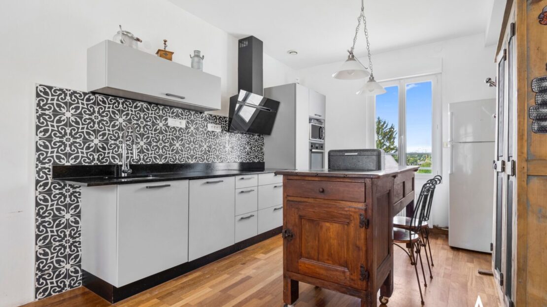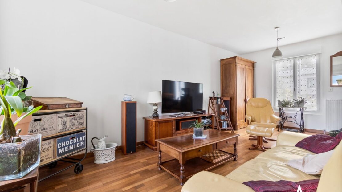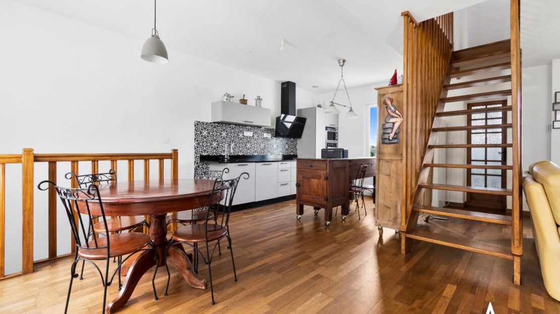 Le rez-de-chaussée surélevé accueille un grand séjour de 58 m², baigné de lumière naturelle grâce à sa double exposition. L’espace salon et salle à manger, d’une grande convivialité, est complété par une cuisine ouverte, créant un ensemble harmonieux et chaleureux avec son parquet et son escalier en bois.
