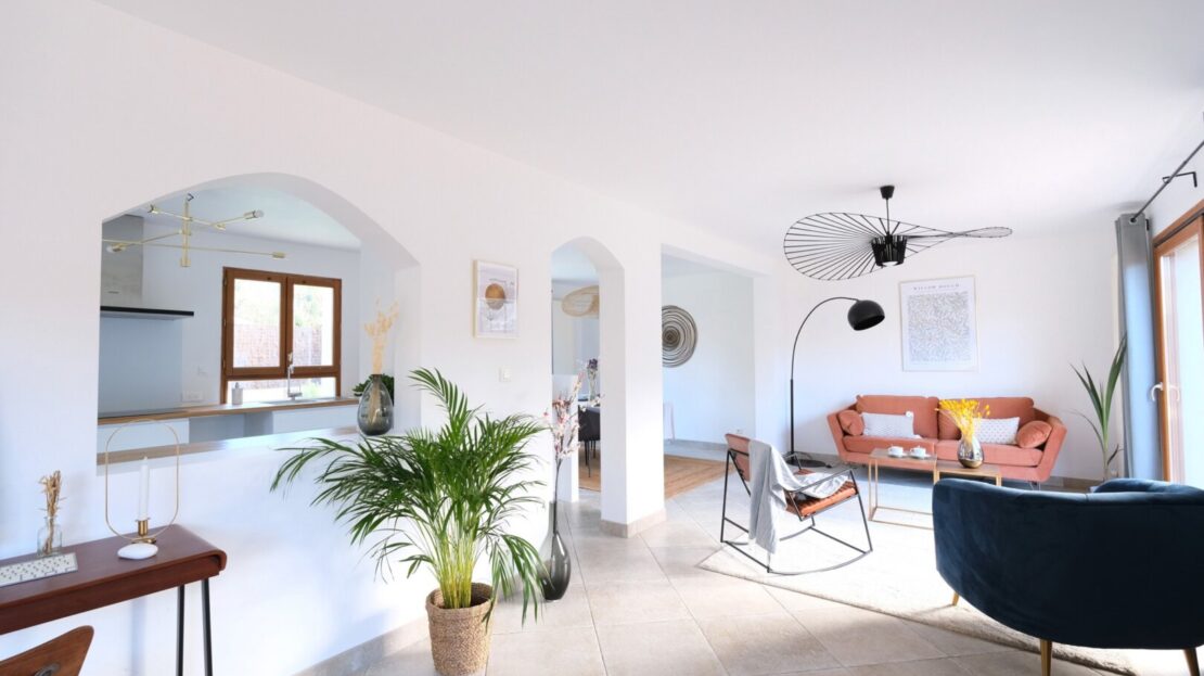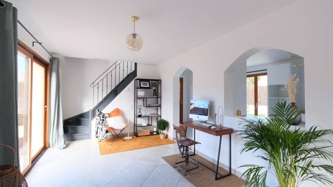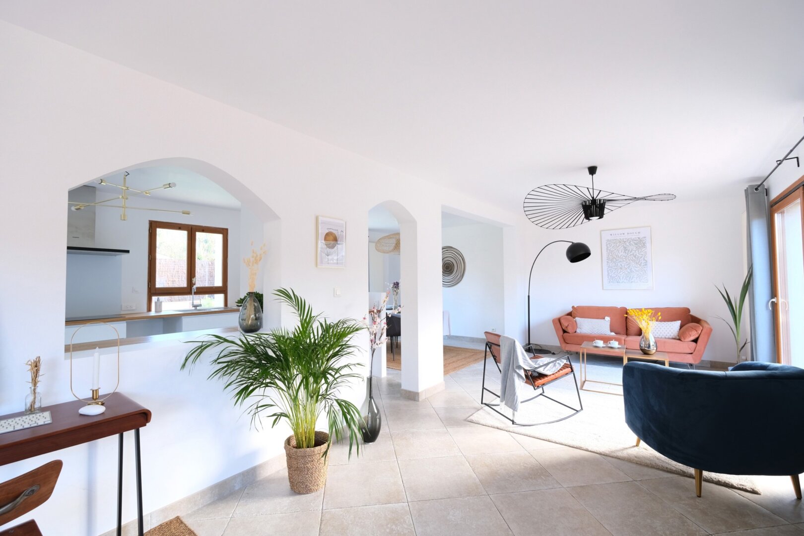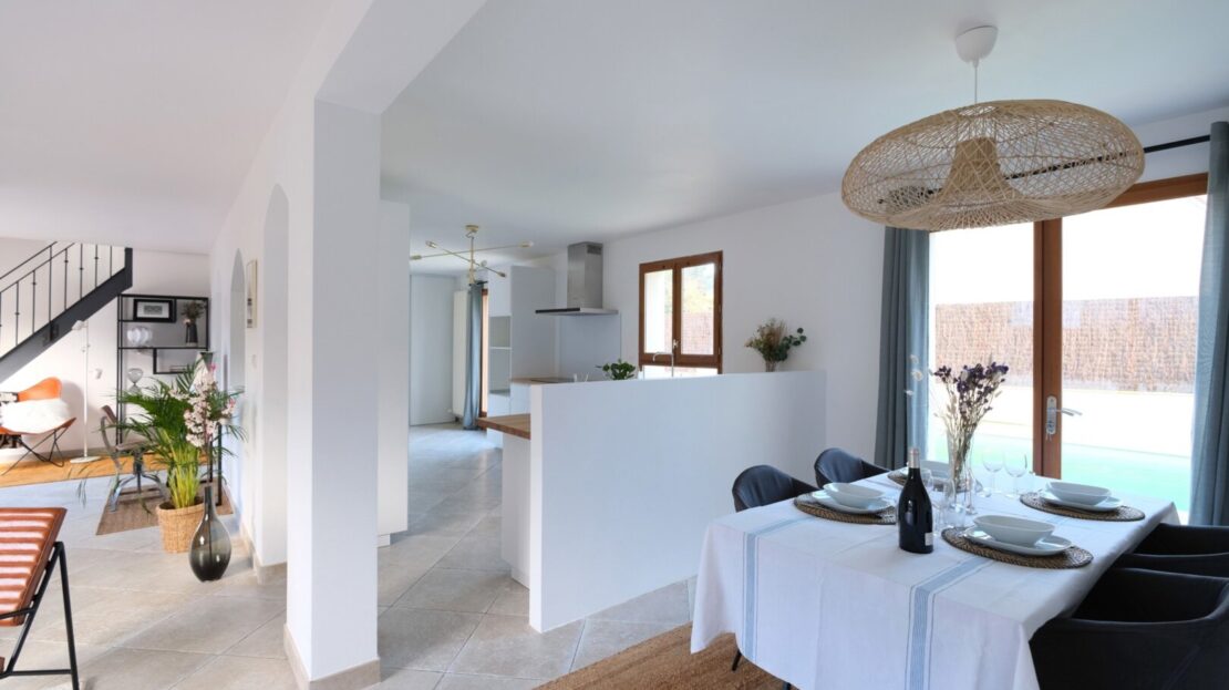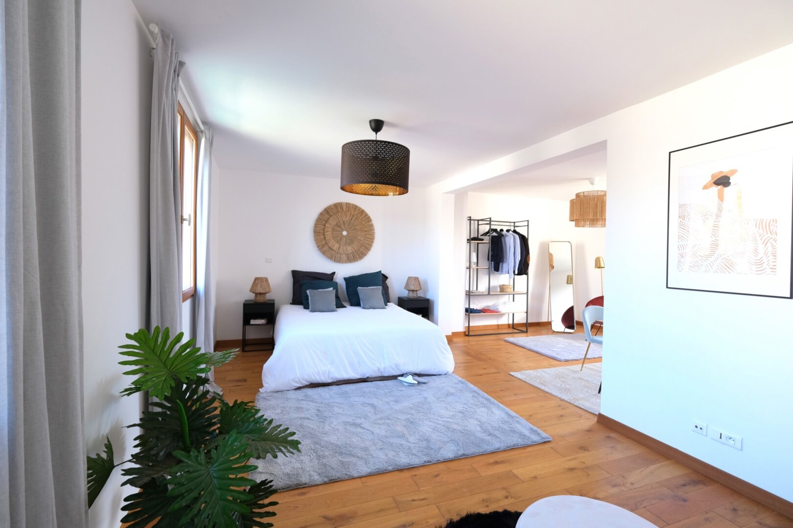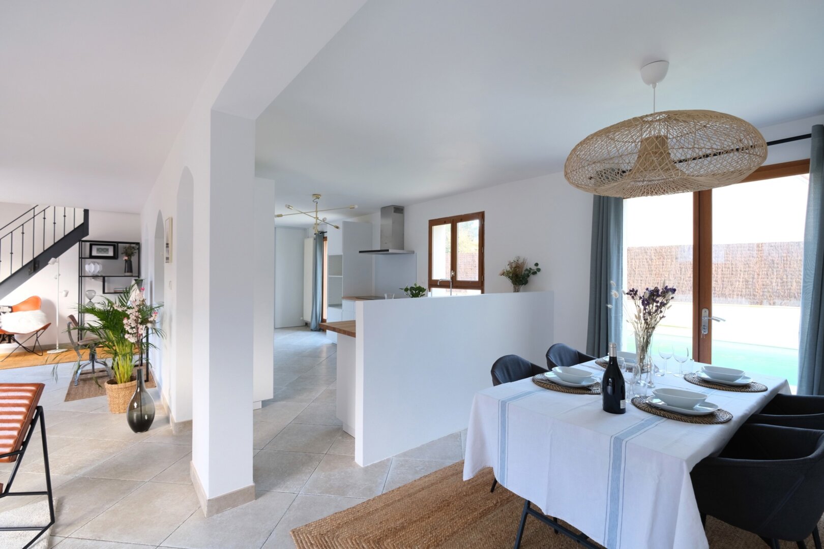 Entièrement rénovée et décorée avec beaucoup de goût, les espaces et les volumes offrent un esprit très contemporain. On entre dans un espace de vie de 64 m2 baigné de lumière et composé d’une grande cuisine moderne, d’un double salon et un coin salle à manger. Les grandes ouvertures de part et d’autre donnent de plein pied sur les terrasses, la piscine et le jardin.