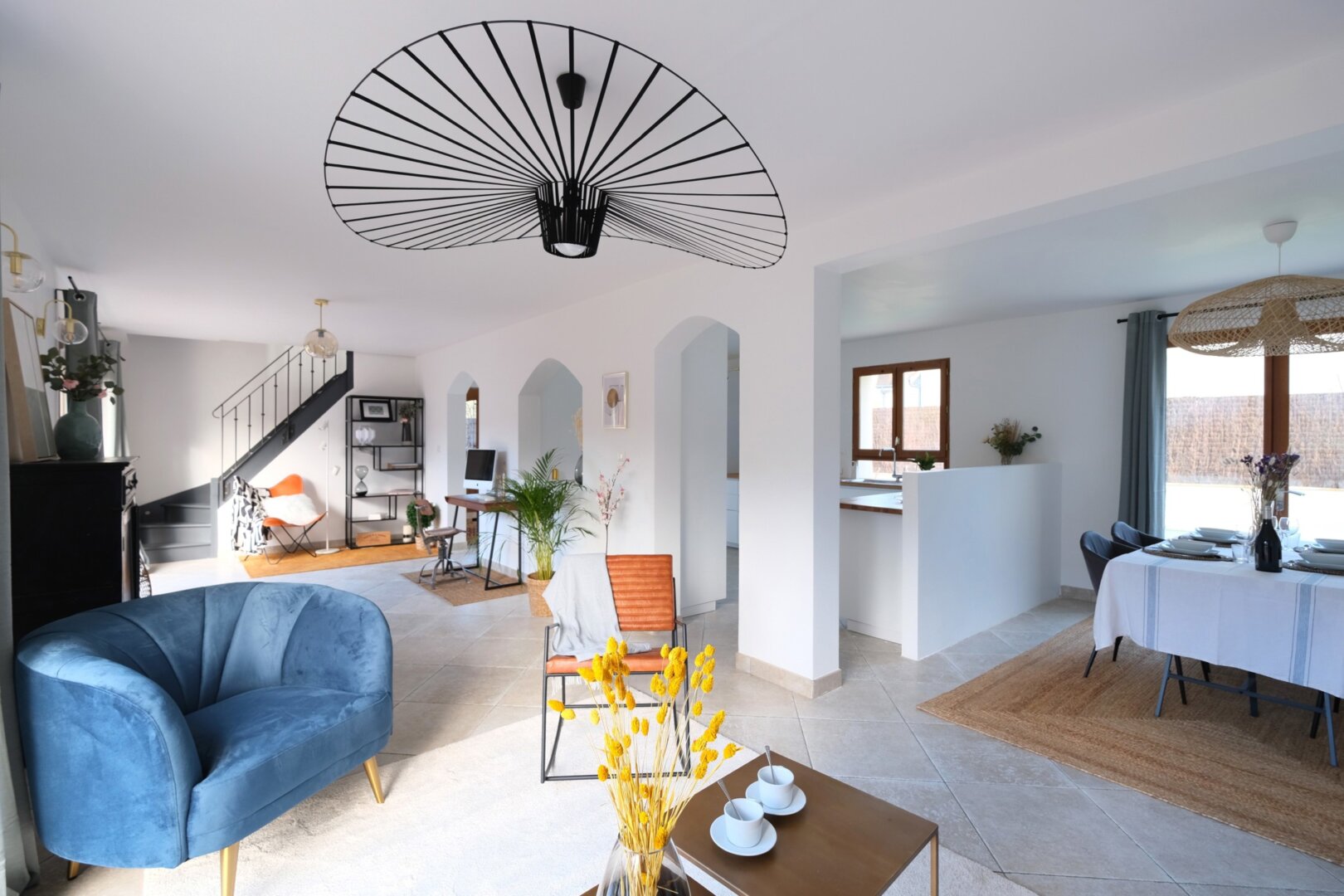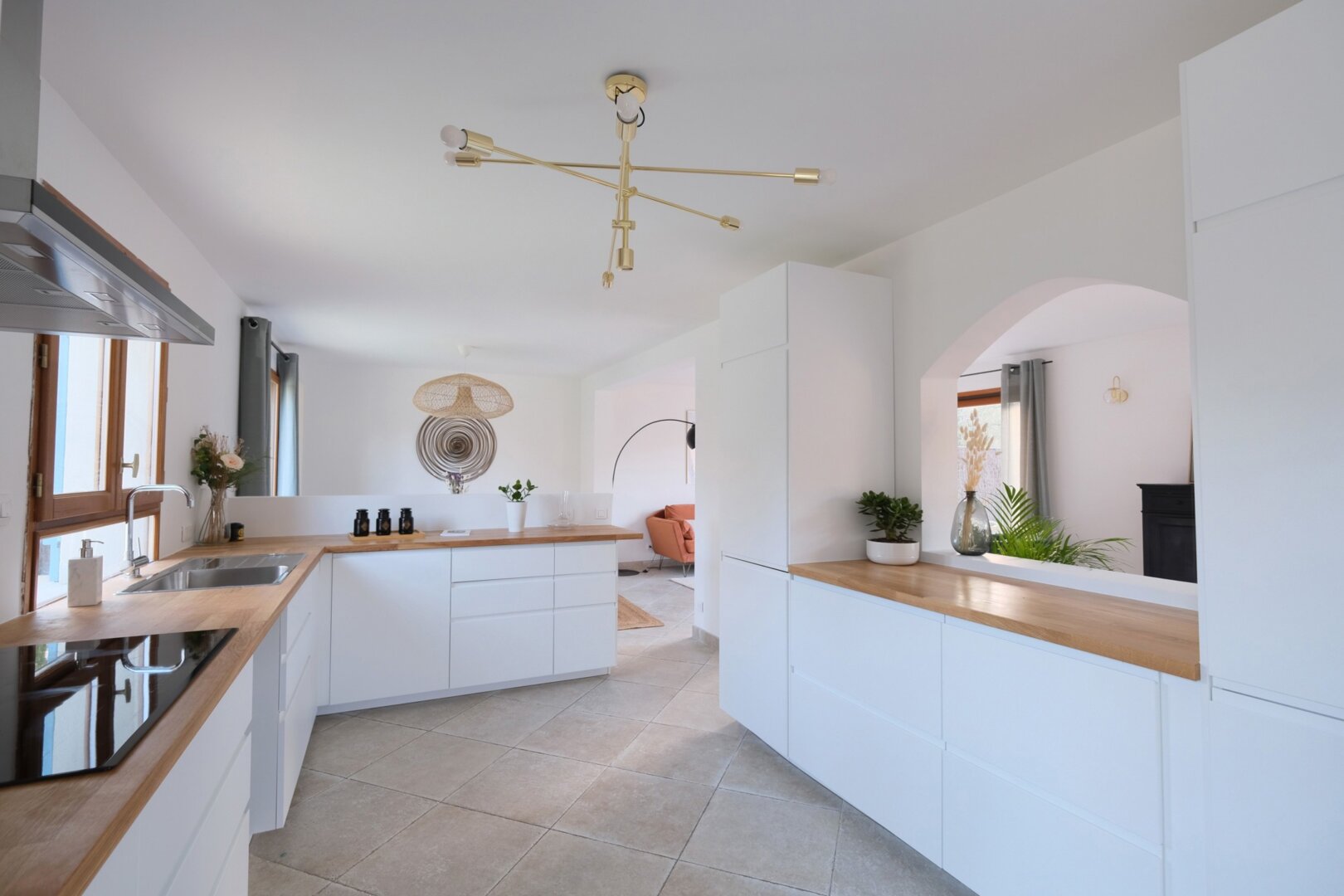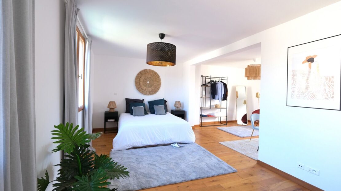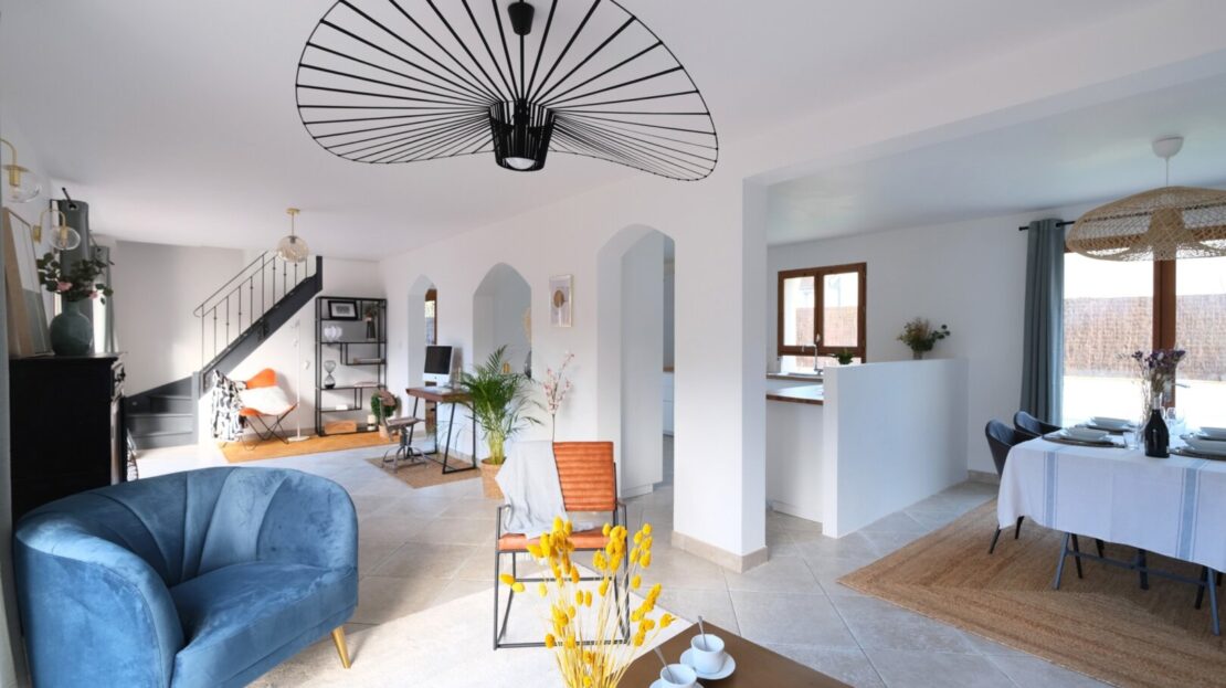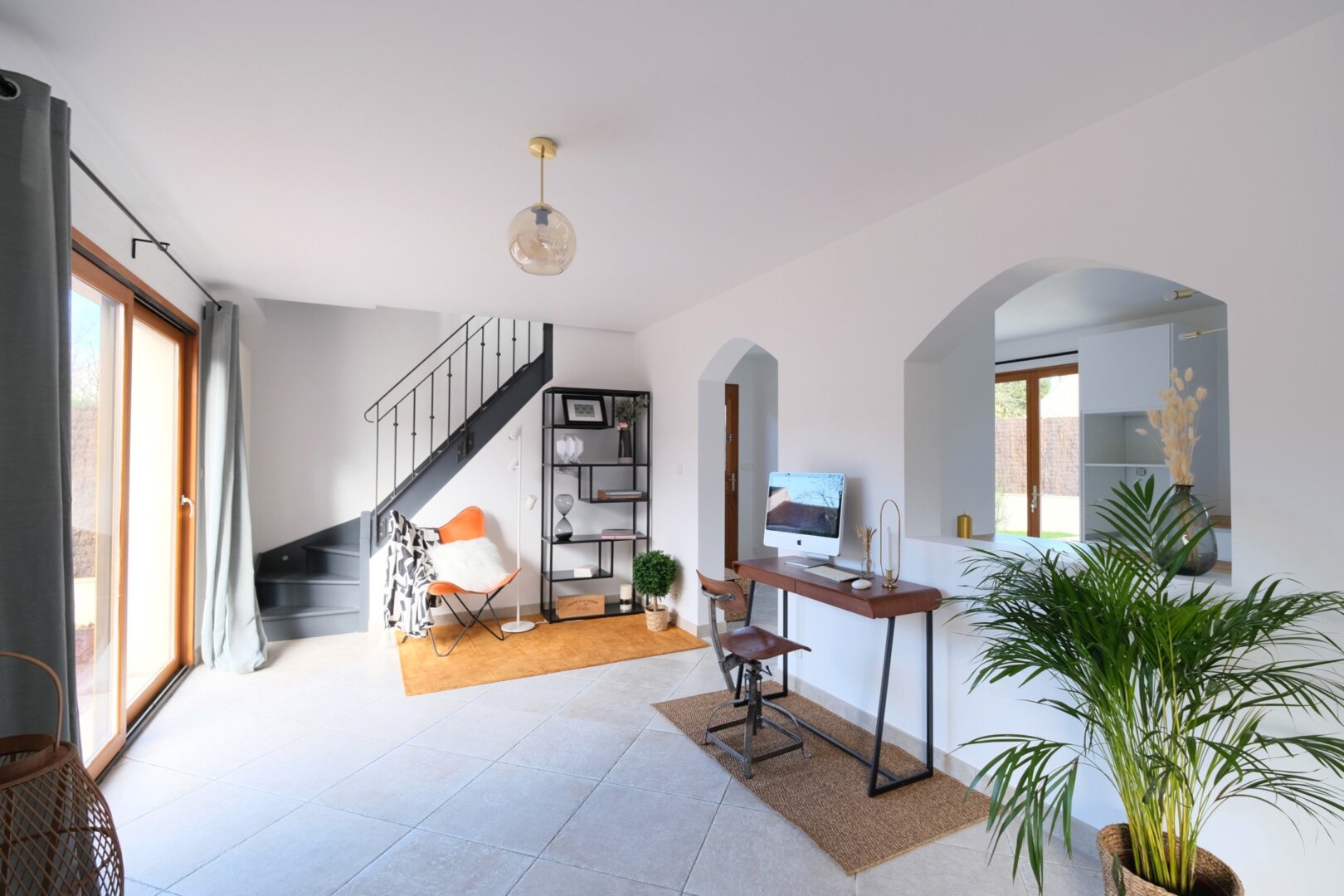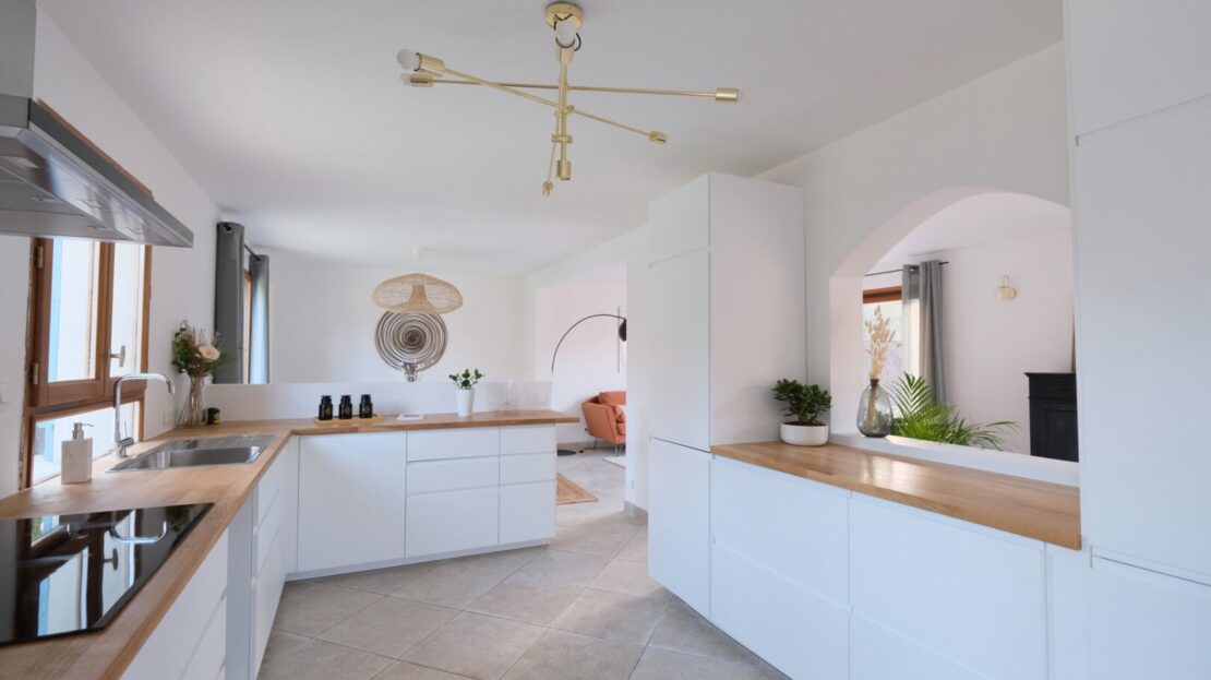 Entièrement rénovée et décorée avec beaucoup de goût, les espaces et les volumes offrent un esprit très contemporain. On entre dans un espace de vie de 64 m2 baigné de lumière et composé d’une grande cuisine moderne, d’un double salon et un coin salle à manger. Les grandes ouvertures de part et d’autre donnent de plein pied sur les terrasses, la piscine et le jardin.