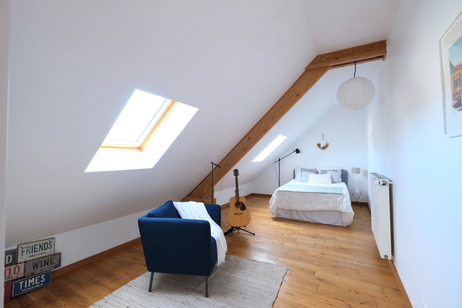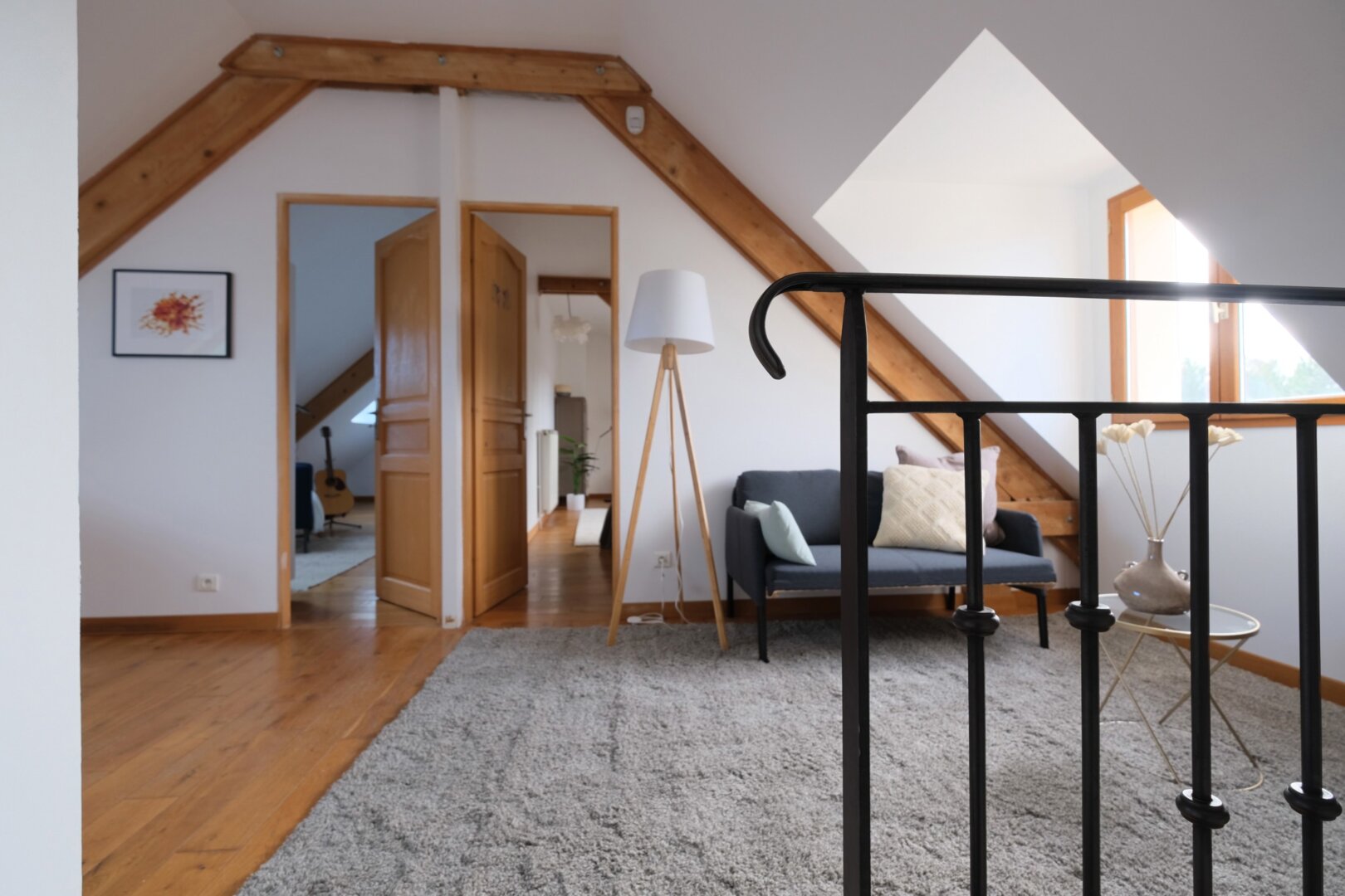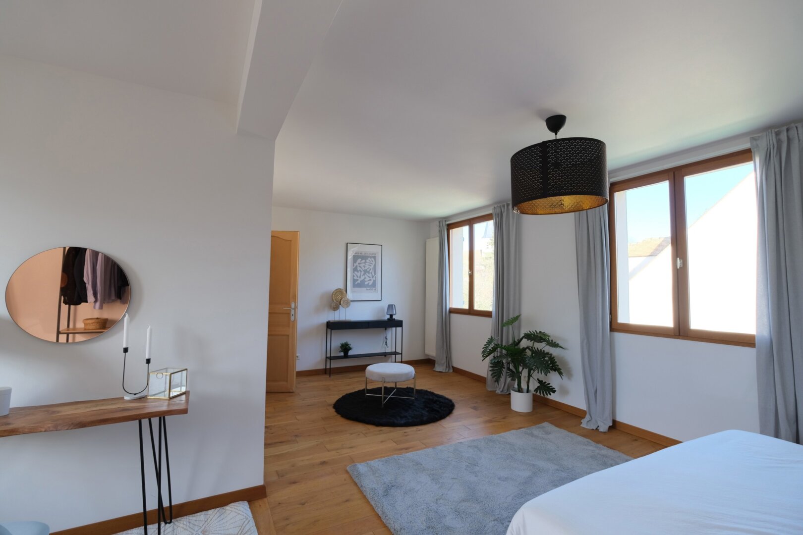 Au 1er étage le palier dessert une grande salle de bains avec wc, communiquant avec un espace parental très spacieux (32 m2), une chambre et une buanderie.