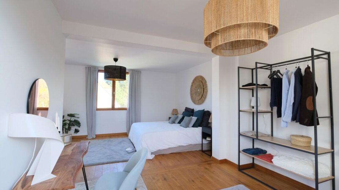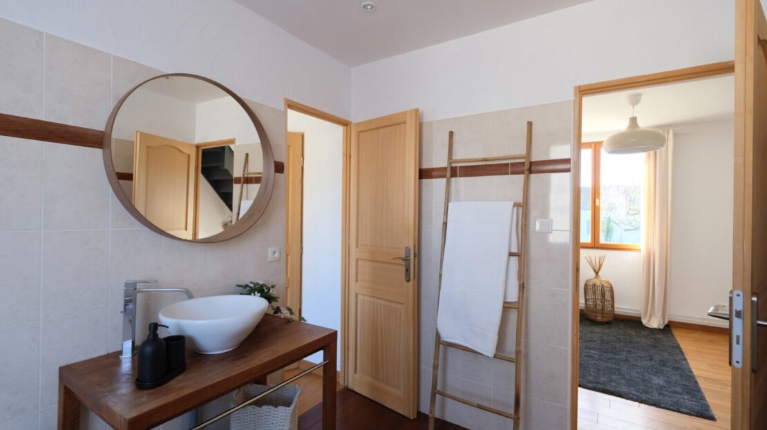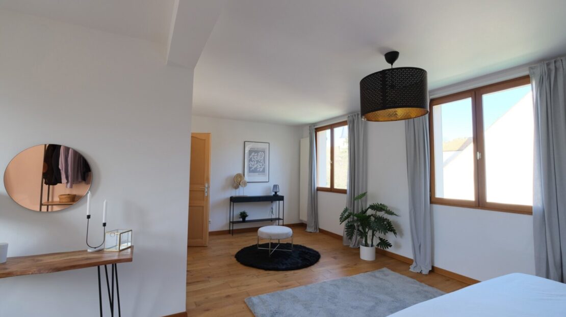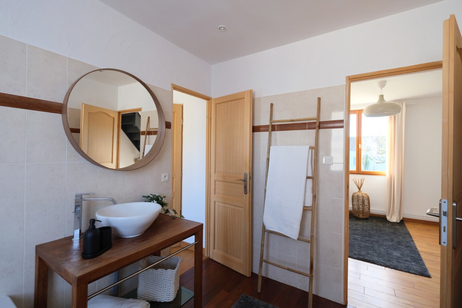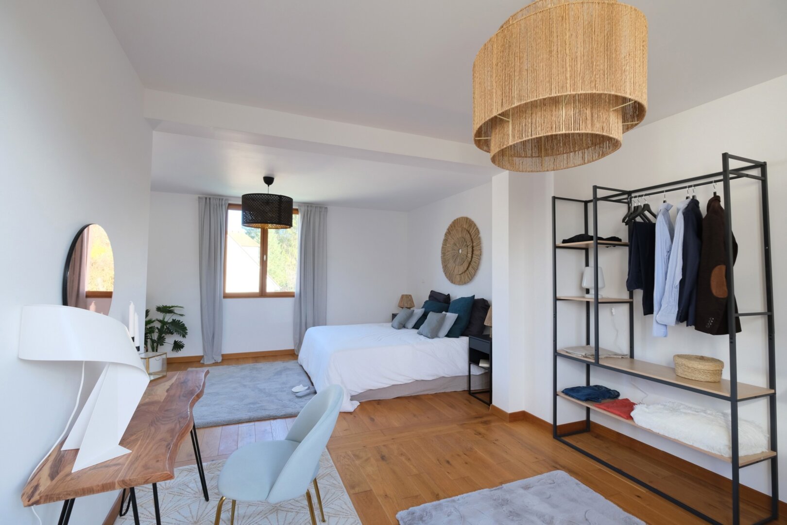 Au 1er étage le palier dessert une grande salle de bains avec wc, communiquant avec un espace parental très spacieux (32 m2), une chambre et une buanderie.