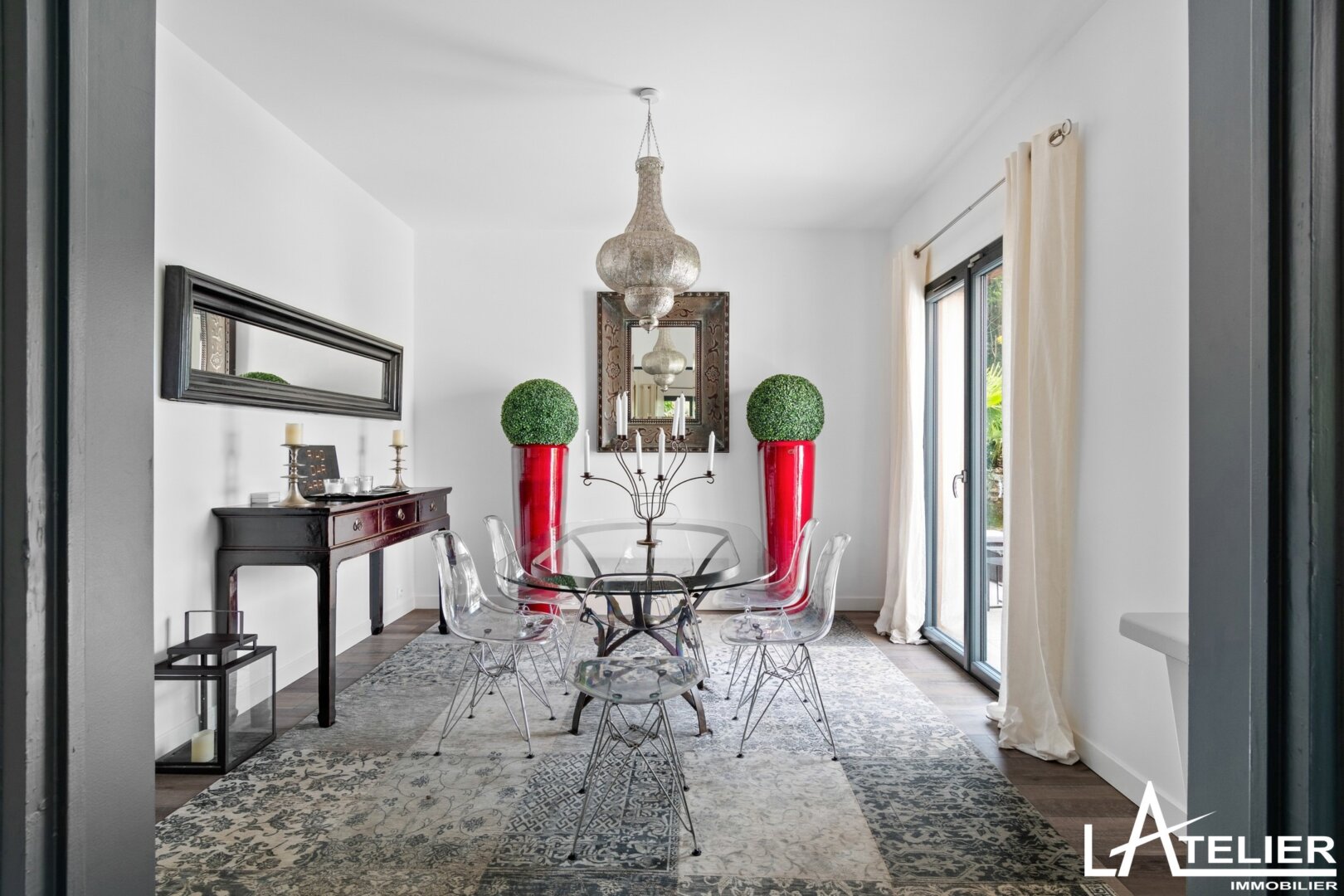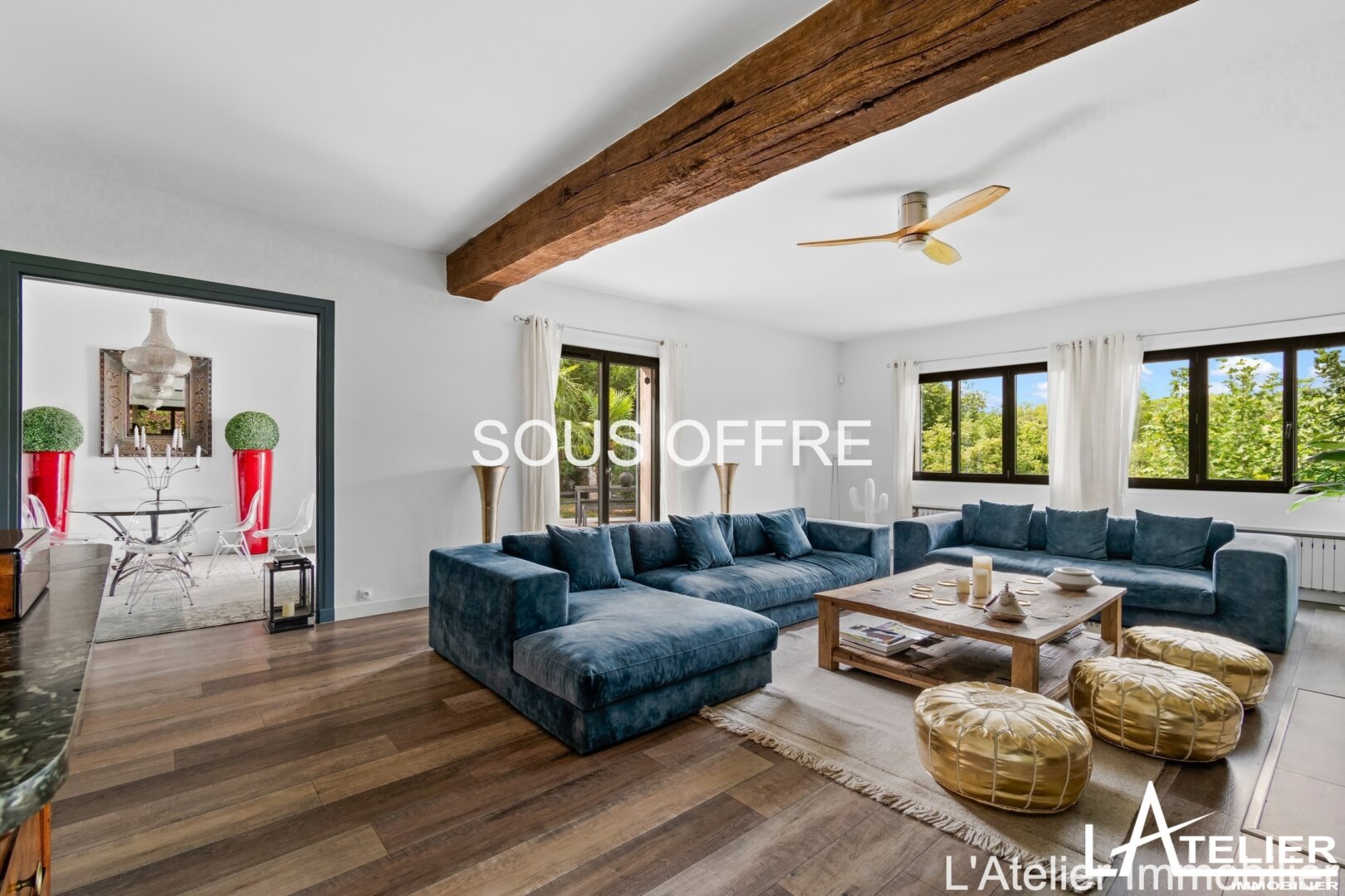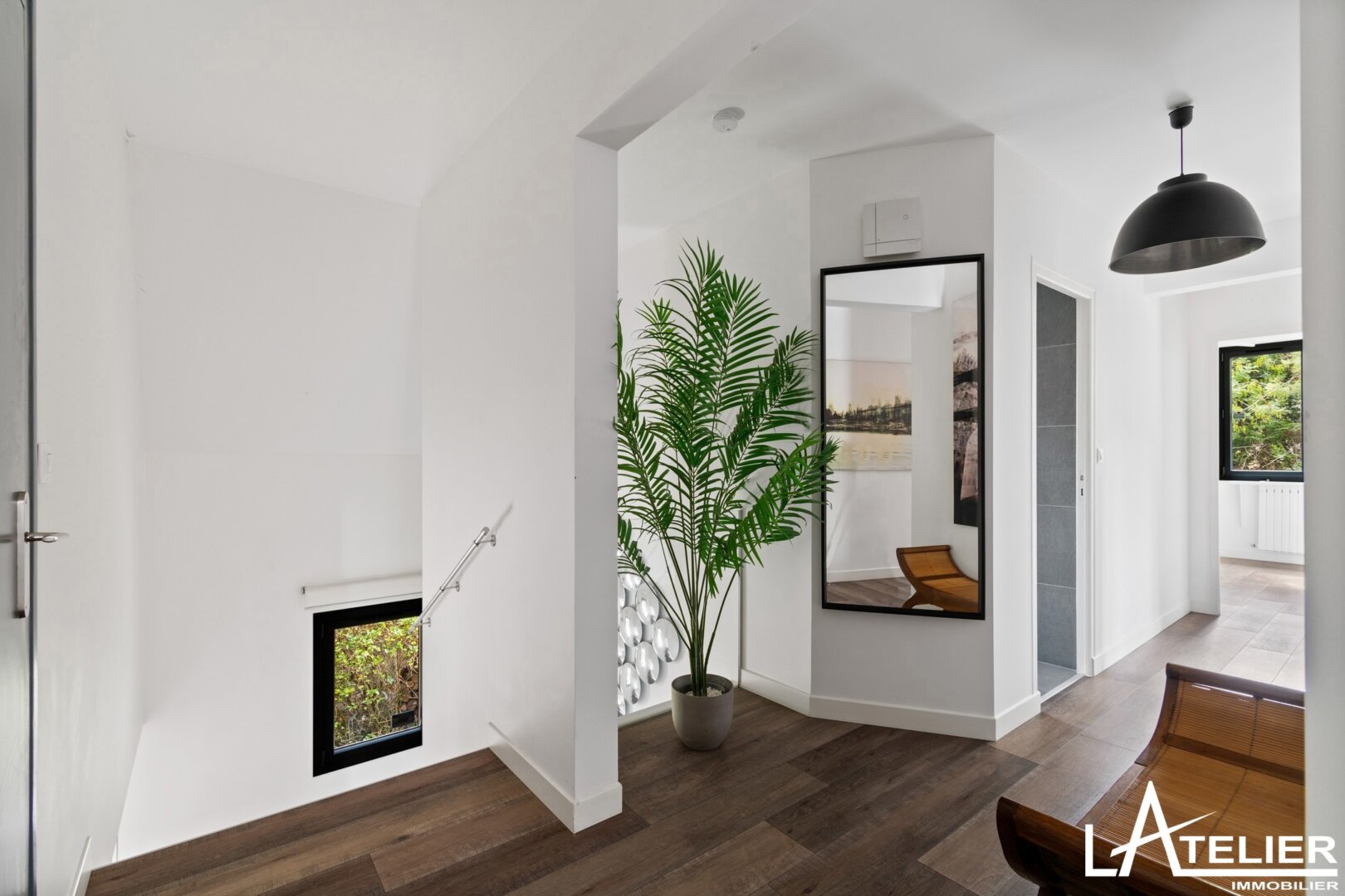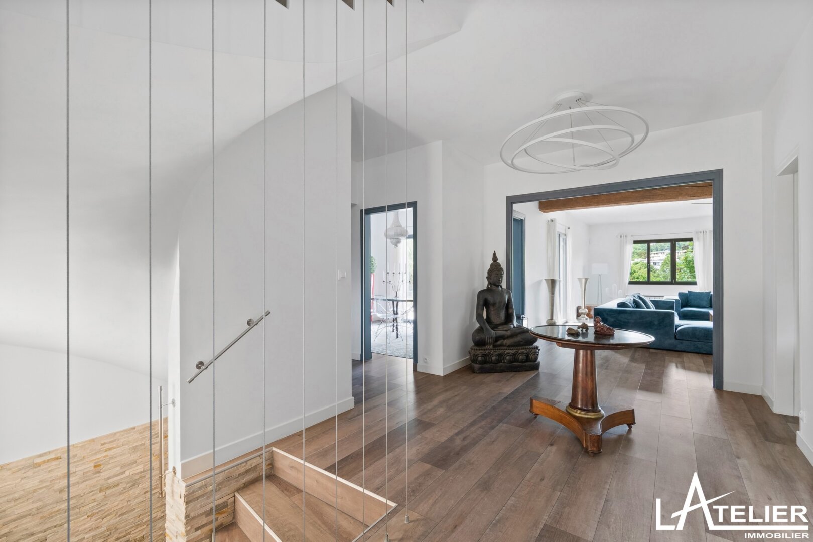 Au caractère unique, résolument contemporain et haut de gamme, cette maison familiale, discrètement nichée dans un jardin très arboré et sans aucun vis à vis réserve de belles surprises. Organisée sur 3 niveaux et entièrement rénovée en 2019, l’esprit à la fois moderne, chic et authentique nous touche dès le hall d’entrée avec la superbe perspective des espaces de vie donnant sur la terrasse et le jardin, les larges circulations entre les étages, et les espaces indépendants pour toute la famille : Pièces de réception d’environ 60 m2 avec cheminée magistrale, cuisine séparée totalement équipée. Espace parentale indépendant avec chambre, bureau, salle de bains/douche/wc.