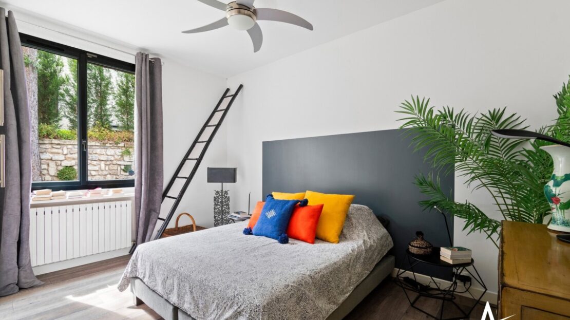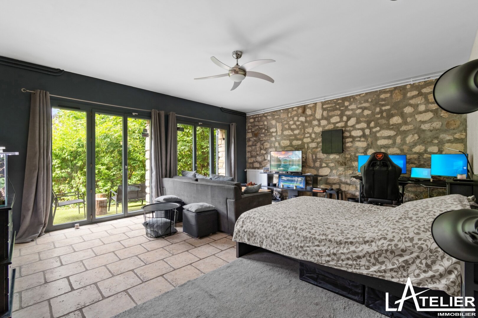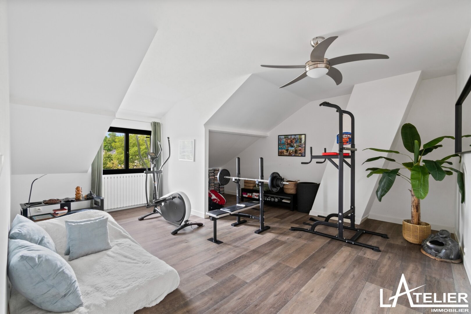 Le 1er étage offre 3 belles chambres, 2 très grands dressings aménagés, une salle de bains/douche/wc. Le niveau du rez de jardin propose une suite indépendante avec chambre / salon de 28 m2, salle d’eau privative, wc et accès jardin.