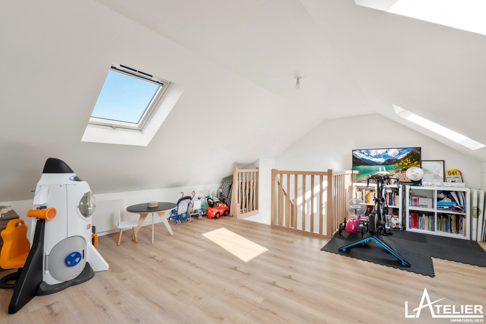 Pour encore plus d’espace, une grande pièce polyvalente récemment aménagée avec plusieurs puits de lumière se trouve au 2ème étage. Ici on imagine l’endroit idéal pour télétravailler, ou jouer pour les enfants.