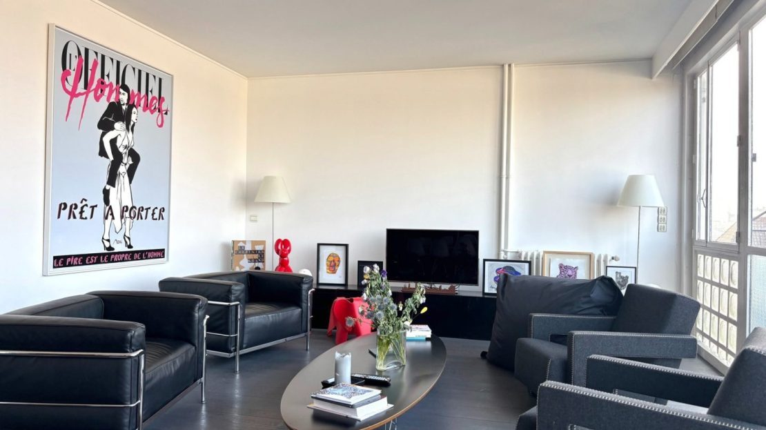 L’appartement se situe au 5ème étage de « l’immeuble Molitor » qui a la particularité de se situer entre la Rue Nungesser et Coli à Paris 16ème et la Rue de la Tourelle à Boulogne-Billancourt. L’espace intérieur de cet appartement de 102m2 s’organise autour d’une galerie desservant la cuisine indépendante, une première chambre et un salle d’eau avec WC. La galerie s’ouvre sur un grand séjour avec espace salle à manger de 42m2 qui bénéficie d’une grande luminosité et offre un panorama exceptionnel grâce à une paroi vitrée du sol au plafond orientée Sud – Sud Ouest. Le balcon filant, avec son garde-corps et ses allèges en brique de verre, ajoute une touche d’élégance et de légèreté. Le sejour donne à son tour sur une deuxième chambre avec salle de bain. L’appartement a été entièrement rénové avec soin, en utilisant des matériaux haut de gamme dans l’esprit de Le Corbusier (parquet en chêne massif sans nœud, couleurs historiques, stores en tissu automatique…). L’appartement dispose également d’un accès à un Box de parking située au sous-sol. Une entrée de service est accessible depuis la coursive donnant la courette et l’escalier de service.