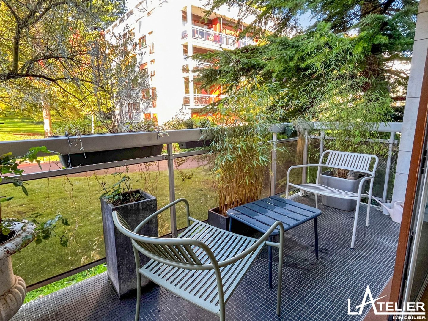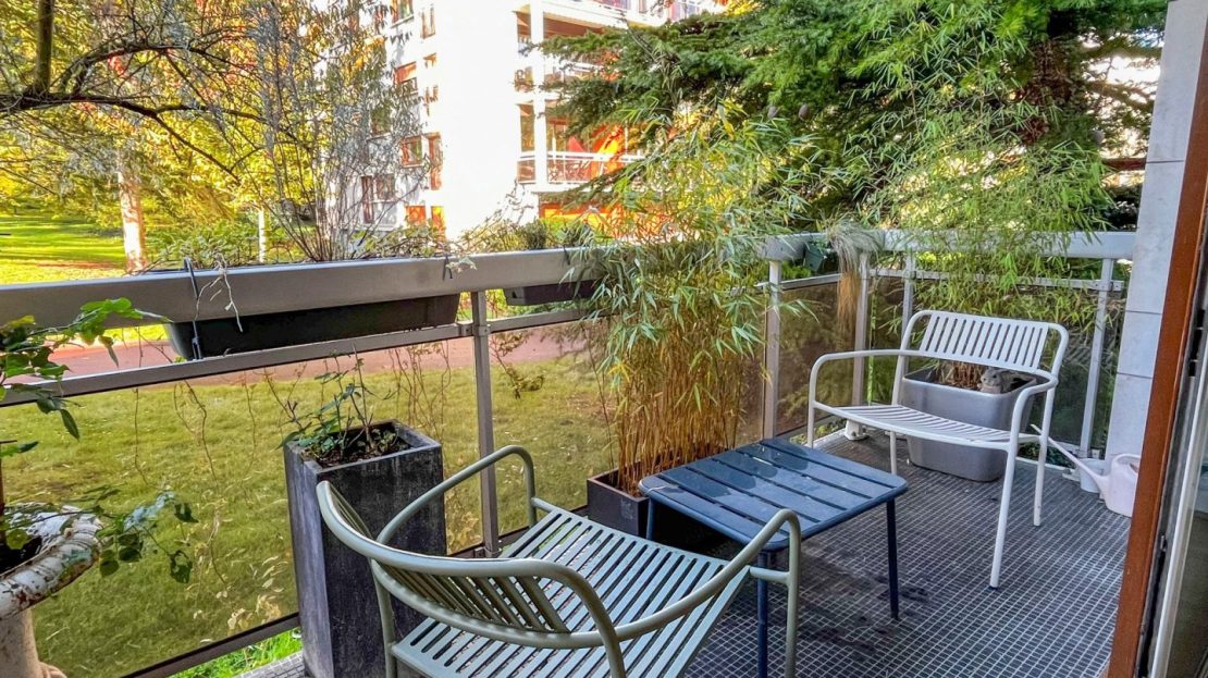 Résidence avec gardien, court de tennis, et local vélo commun. Menuiseries aluminium, parquet et sols contemporains.