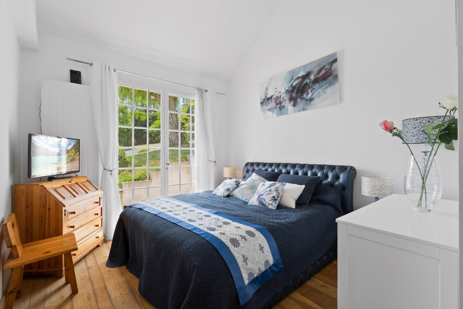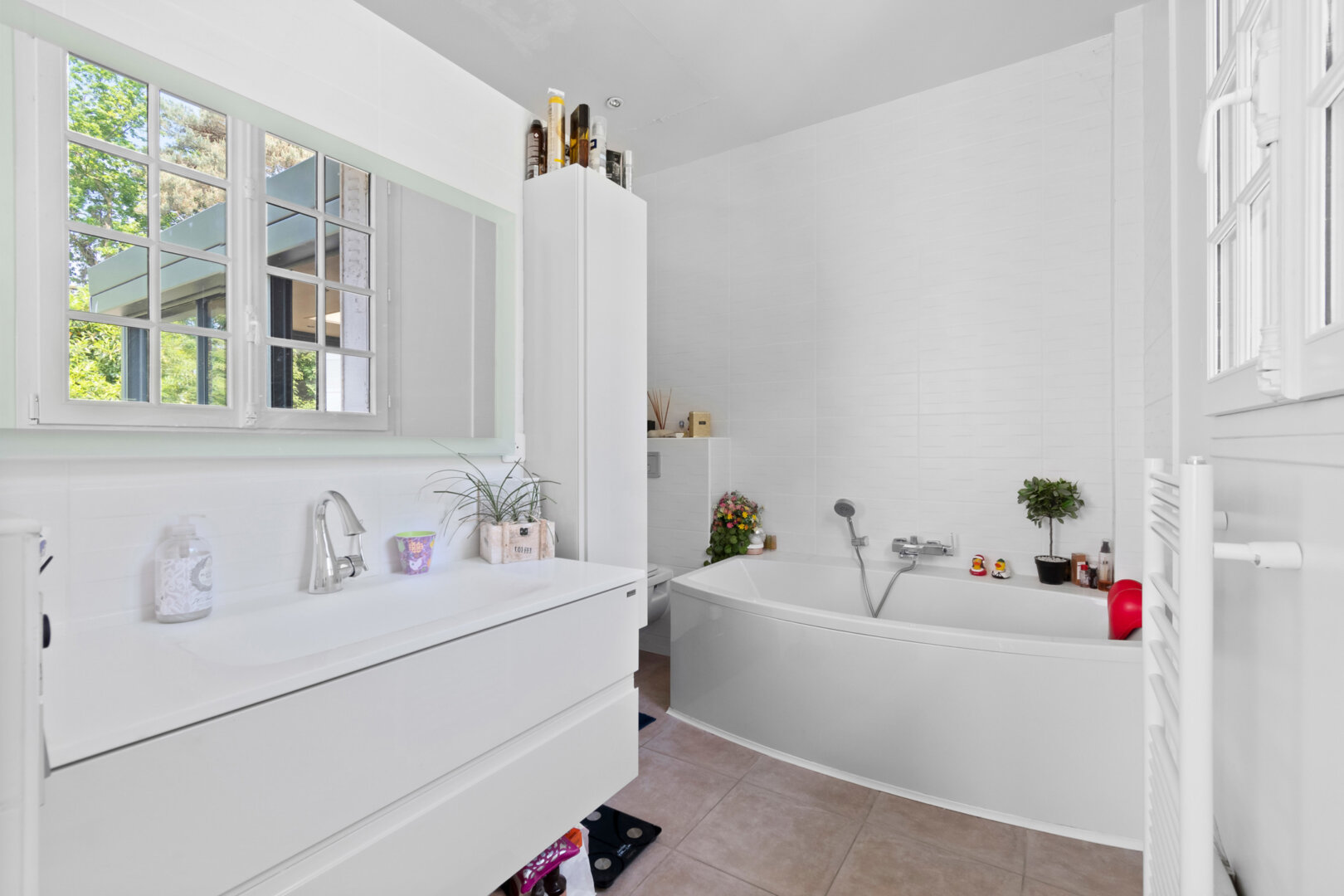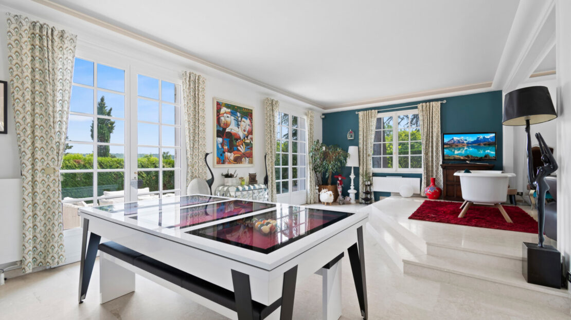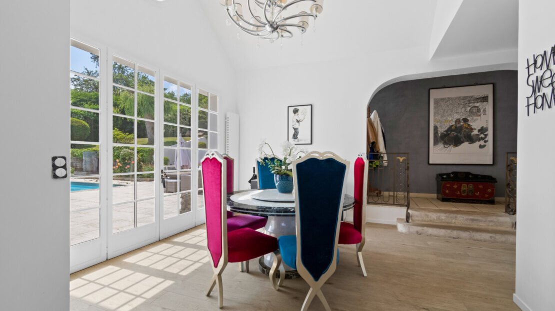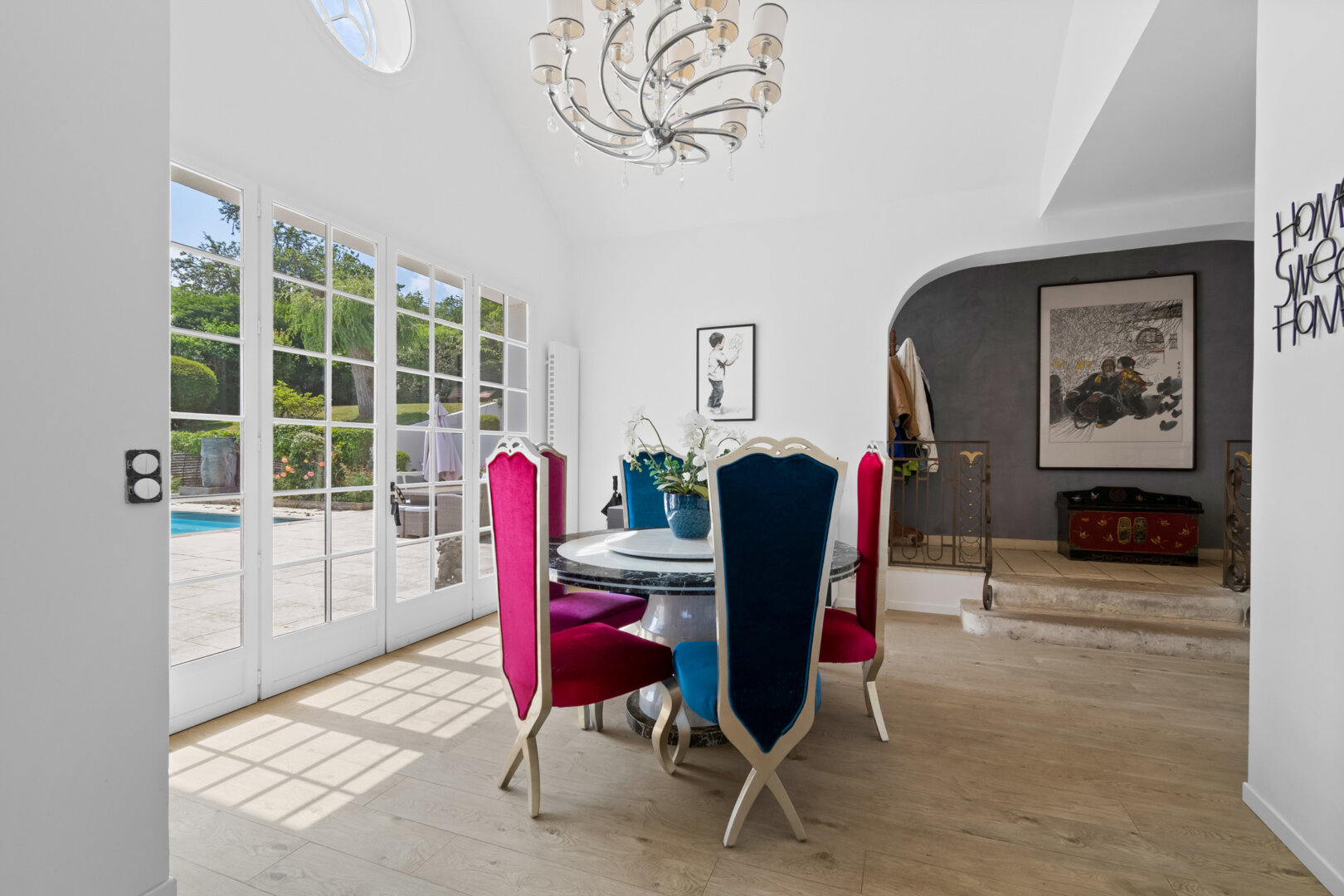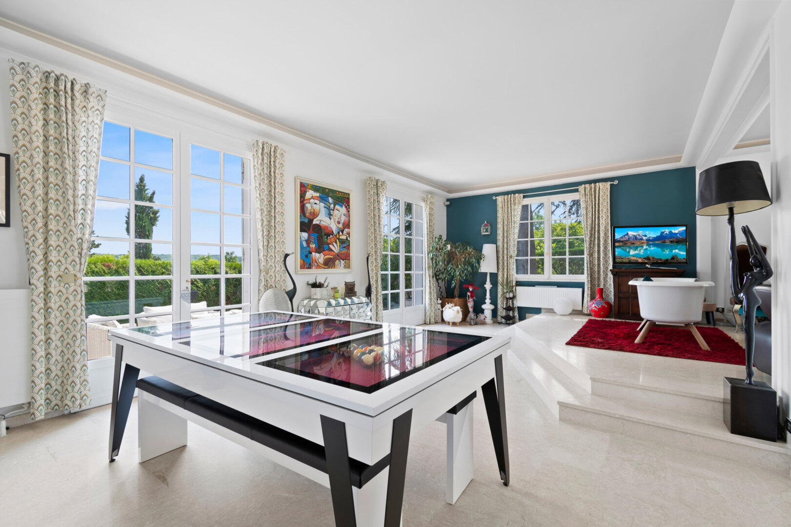 Édifiée en 1970 et 2000 (pour l’aile gauche) sur un terrain de 2044 m2, la maison régulièrement rénovée s’organise en L et offre un caractère très cossu. Les matériaux comme le marbre, les pierres anciennes, le fer forgé confèrent à l’ensemble noblesse et élégance.