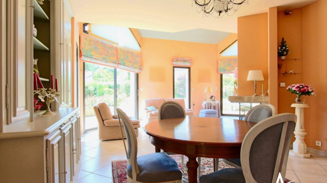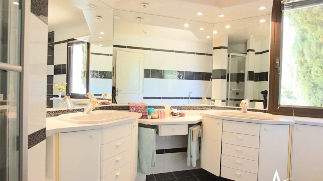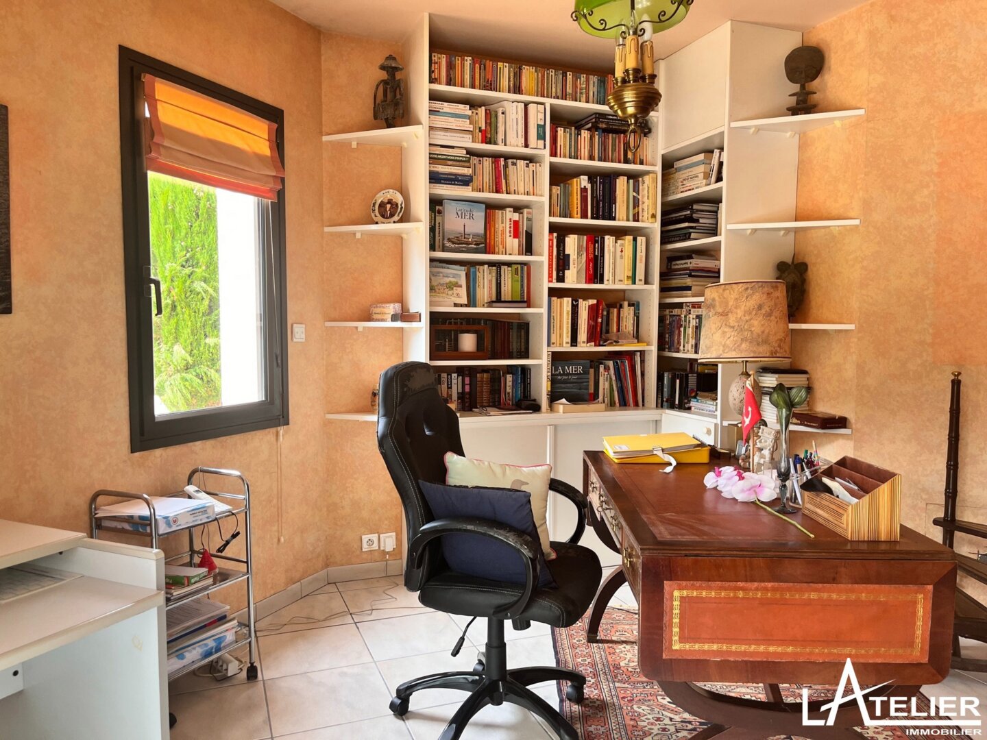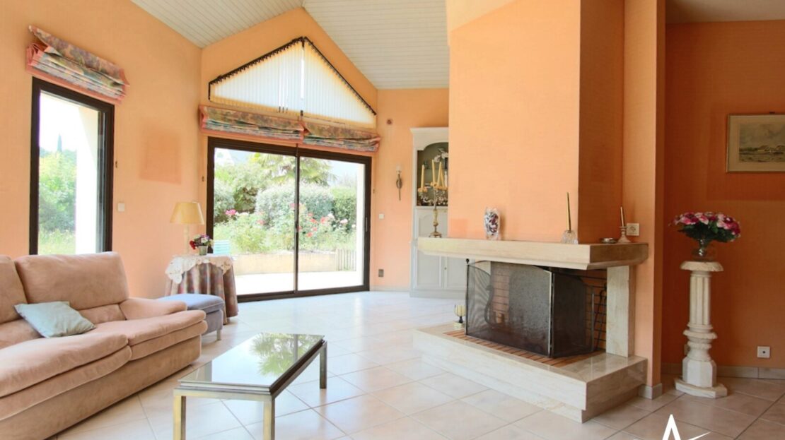 Au rez-de-chaussée, hall d’entrée lumineux de plus de 16m², cuisine aménagée et équipée, arrière cuisine / buanderie, salle à manger suivie d’un salon hauteur cathédrale avec cheminée, bénéficiant d’une double exposition sud et ouest et dont les grandes baies vitrées donnent sur la terrasse et enfin un bureau.