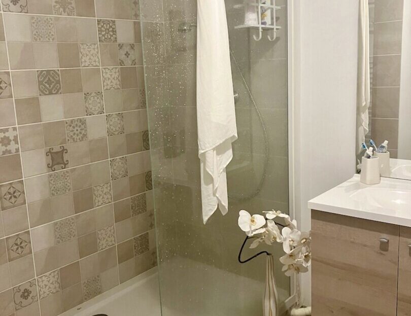 L’entrée comprend des placards et conduit d’un côté à la partie nuit, de l’autre au spacieux salon / salle à manger ainsi qu’à la cuisine parfaitement aménagée et équipée sur-mesure, ces 2 espaces ouvrant sur la terrasse de près de 30m², à l’abri des regards ; la partie nuit comprend un dégagement, la salle de douche confortable, un local lingerie avec un lavabo (2ème salle de douche potentielle), les 2 chambres lumineuses avec placards dont l’une avec un accès direct à la terrasse.